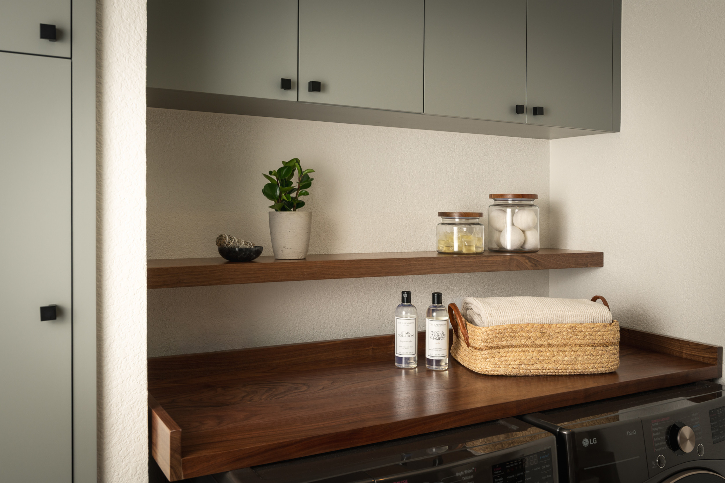 Storage strategies. “We added a long shelf over the washer and dryer, along with a custom walnut tray for ample space to place additional items like baskets or products or to fold clothes,” Getter says. “We also added a tall cabinet for broom and vacuum storage (to the left of the appliances).”