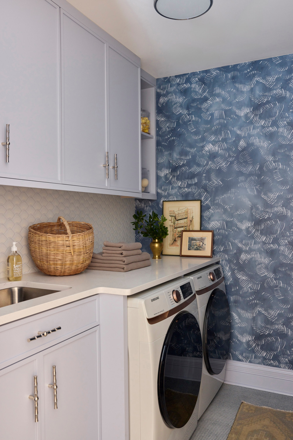 Homeowner’s request. “The homeowner wanted a more functional, well-organized space with dedicated storage for laundry and cleaning supplies,” says designer Erica Peale. “Previously, the room lacked proper laundry hampers, causing baskets to pile up on the floor, and there was no storage for linens or cleaning supplies, leaving the space cluttered. Painted a jarring orange, the room felt anything but inviting.”