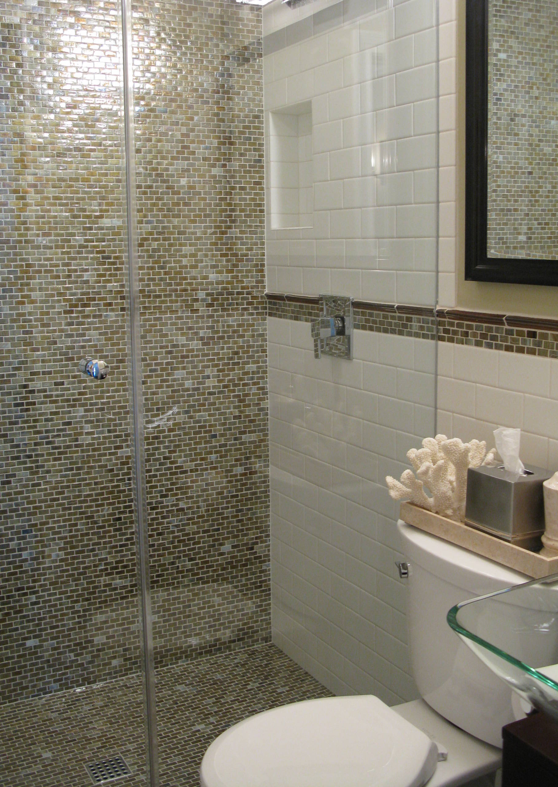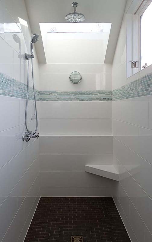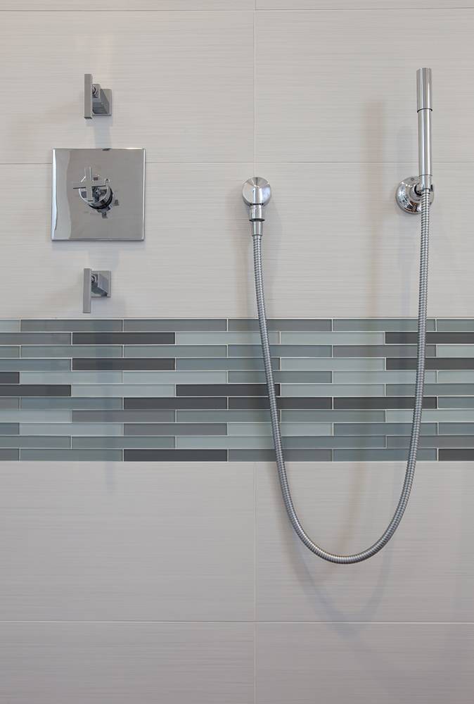In this shower, a larger border closer to 6 inches tall in a long rectangular glass tile really stands out at eye level against all the over-sized white tile.