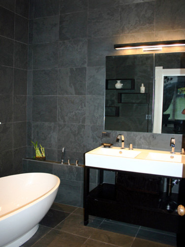 An all-black bathroom is so unexpected that it makes a statement in and of itself. The stark white plumbing fixtures add to the drama. Don't be afraid of running the tile to the ceiling — this black slate won't break the budget.