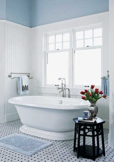 4. Add beadboard or paneling. Wainscot tile square footage can really add up. If you can forgo it in lieu of wood beadboard and mix that with a feature floor tile pattern, you'll have a winner.