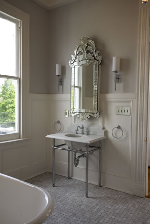 A more formal approach, paneling accomplishes the same feel and budget savings as beadboard. Mixed with the marble mosaic floor tile and the stunning decorative mirror, this bathroom looks like it's fit for a castle.