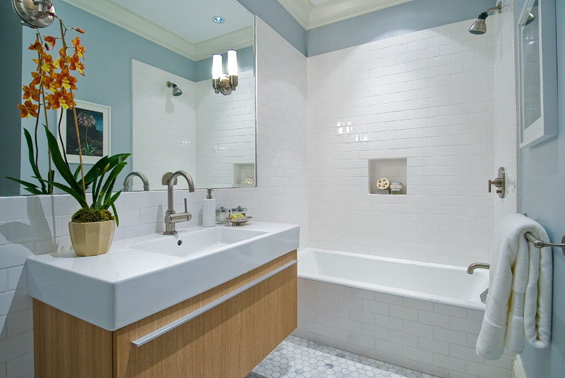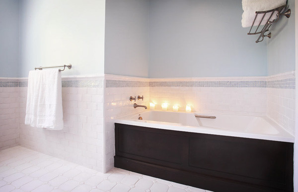 1. Add a decorative border. The white bathroom is as popular as the white kitchen, and basic white tile — whether it’s a 4"x4” or 3"x6” — can be really affordable. Mosaics can be pricey in comparison, especially if you want to do your whole bathroom in them. You can add some of their visual interest without spending a lot of money by using them in contrasting border. This technique has been around for a long time, as anyone with a vintage bath can tell you. Here, a double row of green mosaic glass tile up high on the wall, mixed in with a classic white subway tile, does the trick.