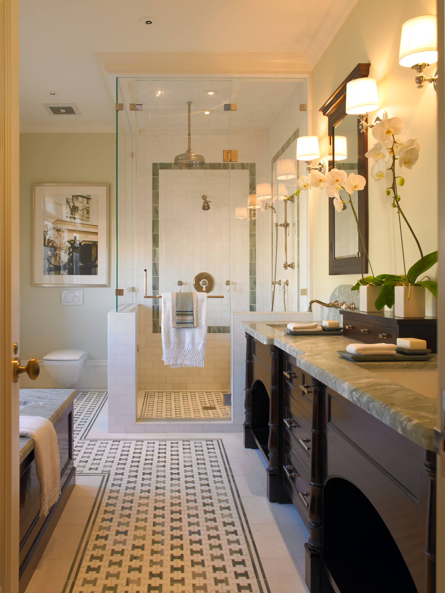 A double band of dark pencil liner sandwiches a white marble mosaic border along the top of this shower. My eye goes straight to that detail so I barely notice that the rest of the field tile is large format (and therefore less expensive). This bathroom looks like a million bucks due to the creative use of line and the contrast of light and dark stone.