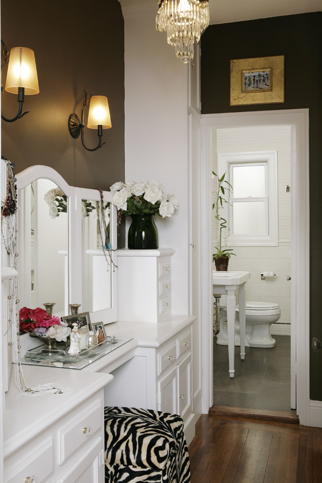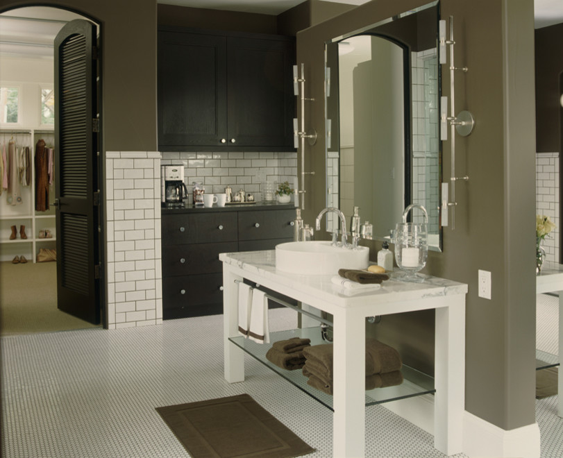 6. Add a bold wall color A simple and classic white bathroom with hexagon floor tile and white subway tile goes from basic to fabulous using an unexpected mocha wall color. Don't be afraid to use dark wall colors when you have all that white tile — as you can see, the drama it creates is wonderful.