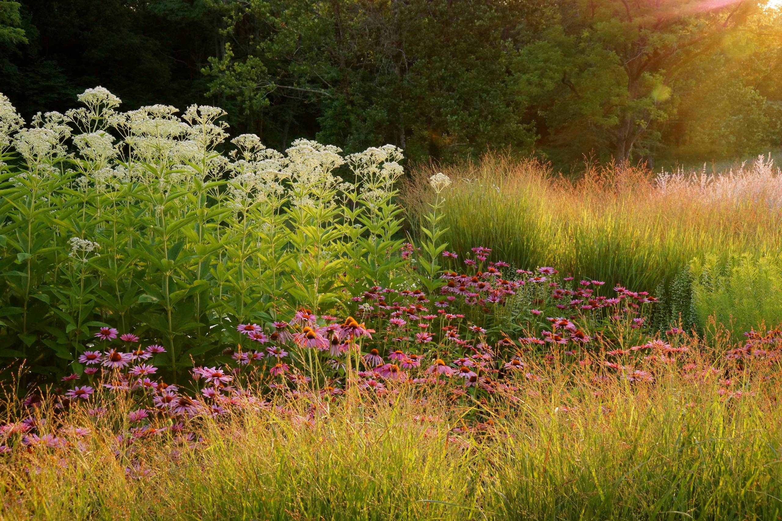 This is a close-up of a much larger garden, but you can see how drifts and masses are working on both informal and formal levels among the plants themselves. Grasses up front encircle the coneflowers, while both lead up to the taller Joe Pye Weed blooming white. There’s both a formal, stepped succession of height we expect in a tended garden, and a more informal surprise as the viewing angle changes from point to point; the intermingling drifts provide new vistas as we walk the landscape, creating surprise and cohesion at the same time.