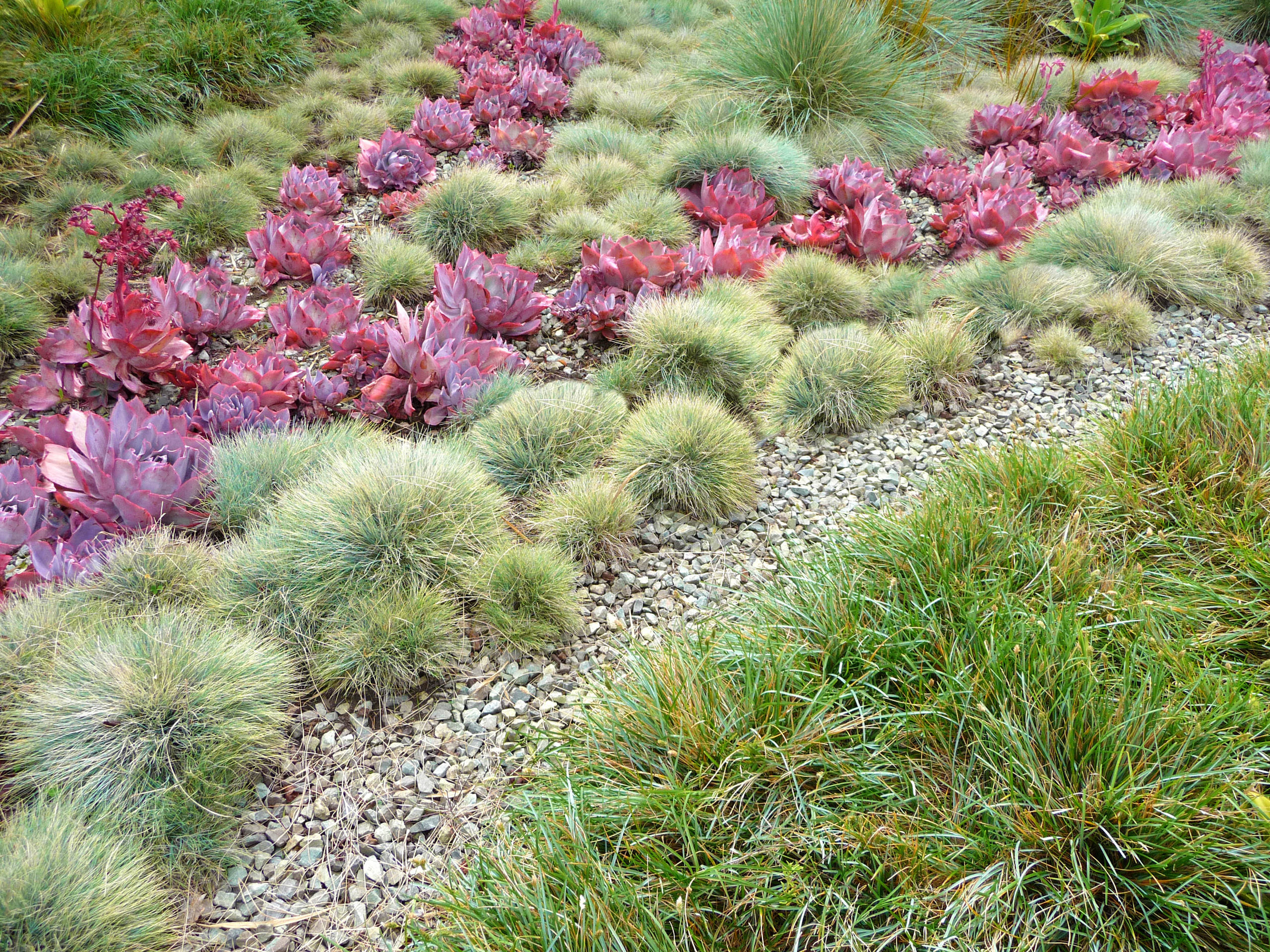 Of course you can be more more formal with succulents too, as in this space, where purple echeveria is woven among grasses. You can clearly see the larger pattern of the drifts forming in this close-up of the garden, and how similar heights help the landscape feel cohesive and thought out.