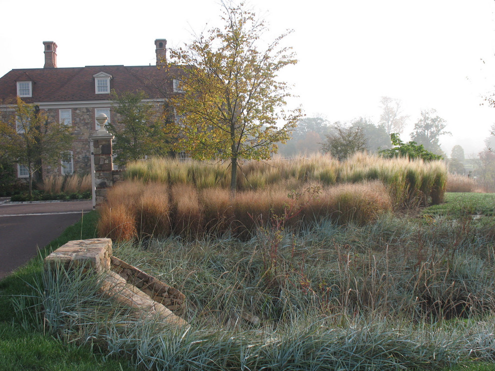 3. Tie a larger landscape together. The balance and weight of plant drifts can anchor a view in a larger landscape and prevent it from overwhelming or becoming visually dysfunctional. A large swath of the same grasses balances the heft of a built structure or grove of trees, or lends a more formal air when flanking a visual centerpiece, like a house.