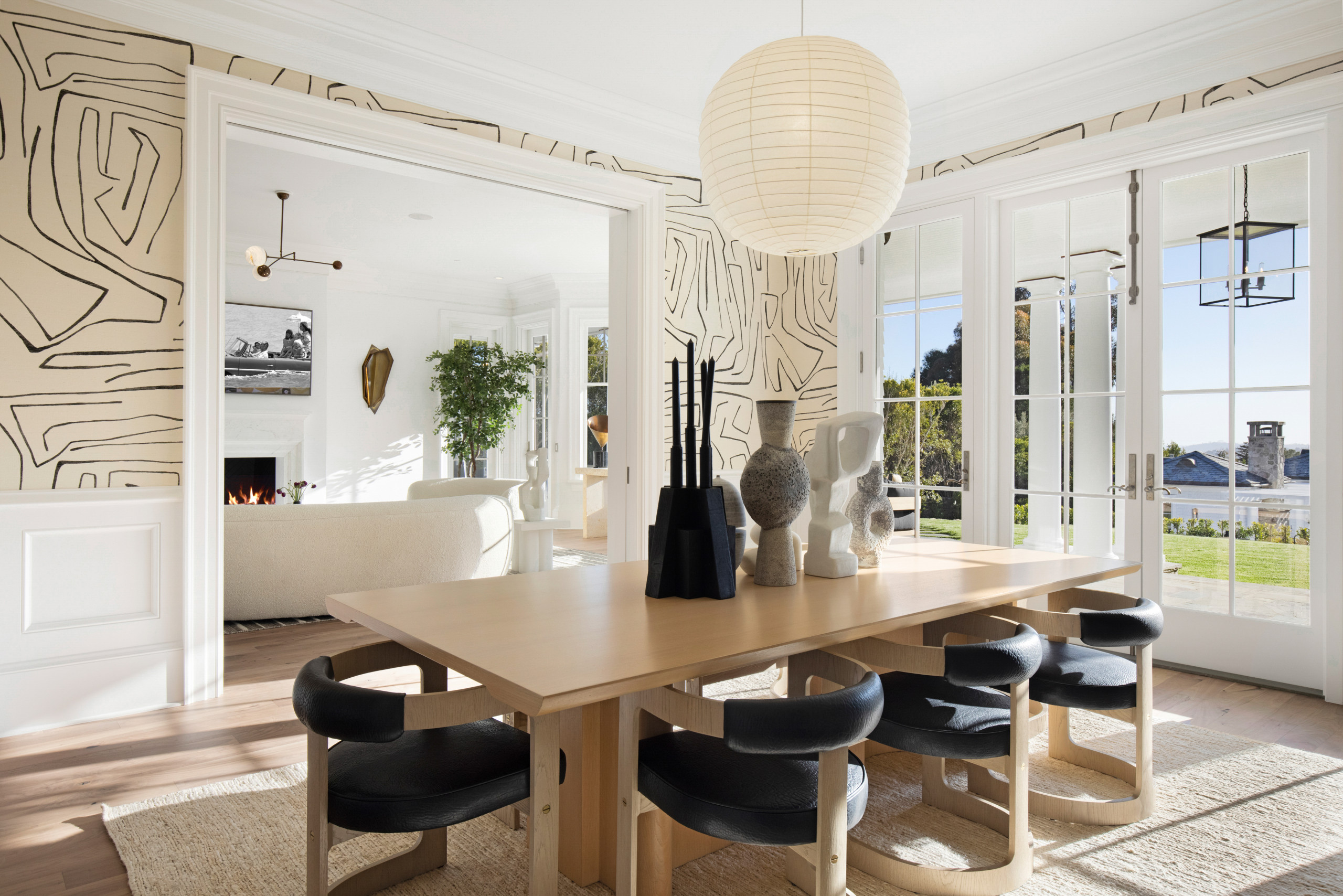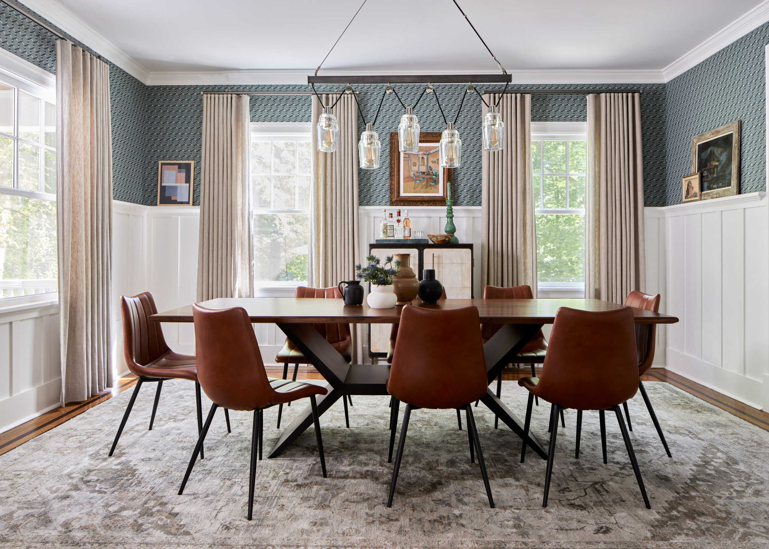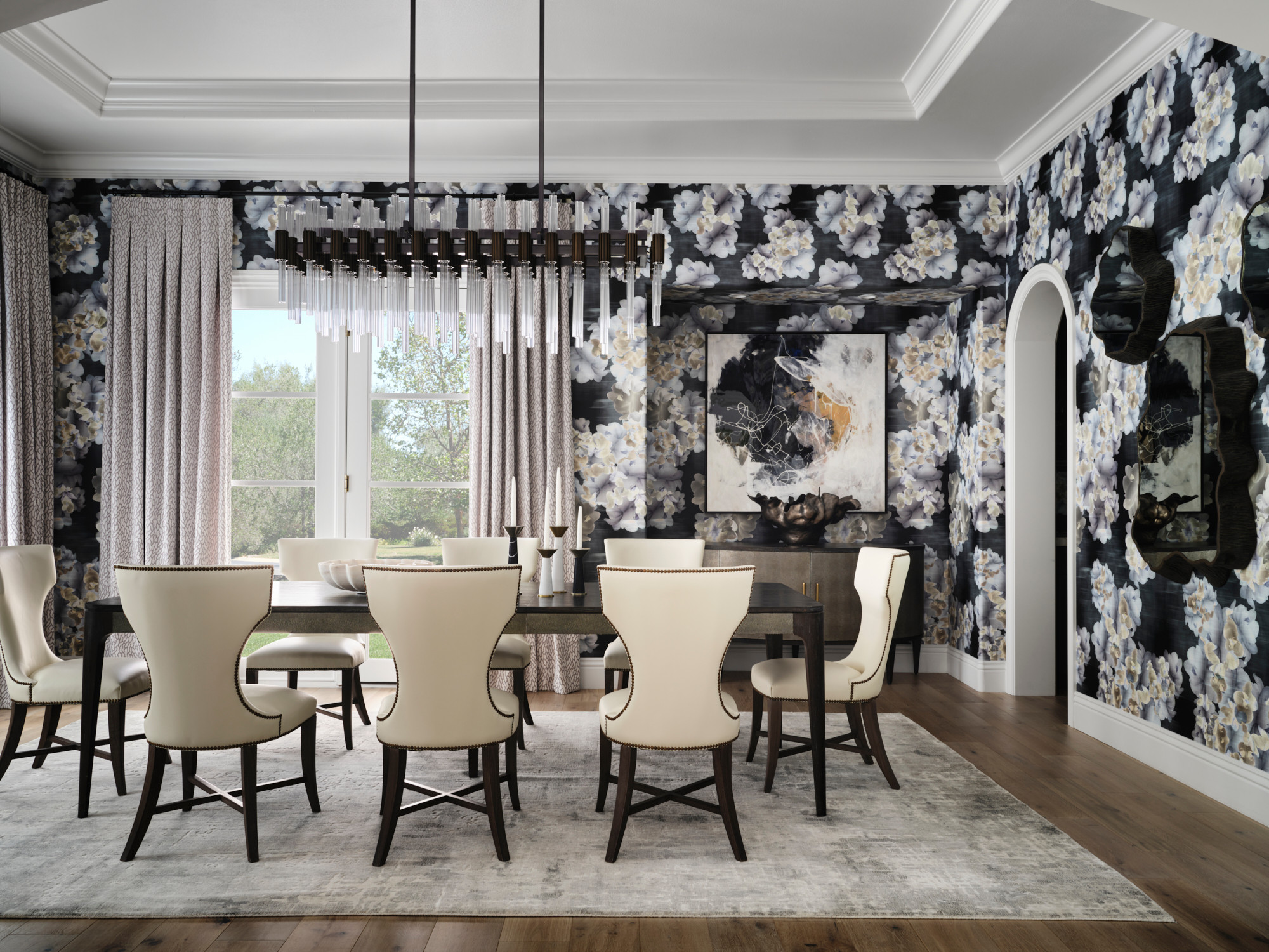 Special features. “The wallpaper is the star in this dining room, creating a strong focal point and moody vibe,” Howard says. “The architectural detailing stands up to the strong pattern with the wide molding, archways and tray ceiling. The space is grounded by the European white oak flooring, which adds a softer, organic base throughout. The custom chandelier by Wired Custom Lighting and chest by Theodore Alexander support the edgy energy of the space, while the clean lines of the drapery and the table offer calm relief.”