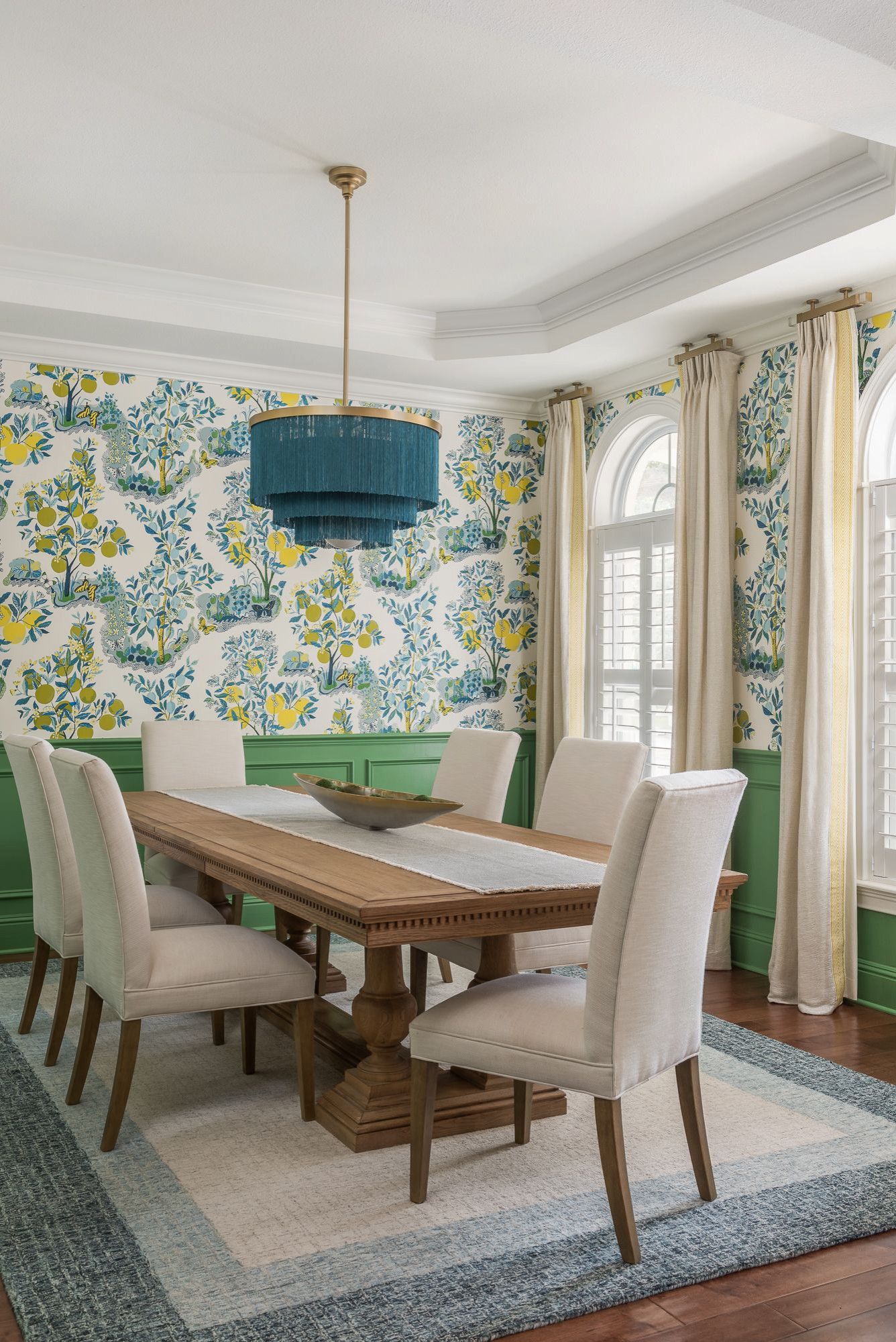 Special features. “This room all started from the Schumacher Citrus Garden wallpaper and we built the other elements off of that,” Melvin says. “The homeowner had the wallpaper — shown above the wainscoting — saved on her Houzz account for years and had been waiting for the perfect opportunity to use it. The dining room is the first space you see when you walk into the home, so we wanted to make sure this space set the tone for the design you would be seeing throughout the home. We matched the green leaves in the paper to Sherwin-Williams Reseda Green for the wainscoting. For the Surya area rug, we pulled the Pantone colors in the threading to make sure we were spot on with the blue tones shown in the wallcovering as well.”
