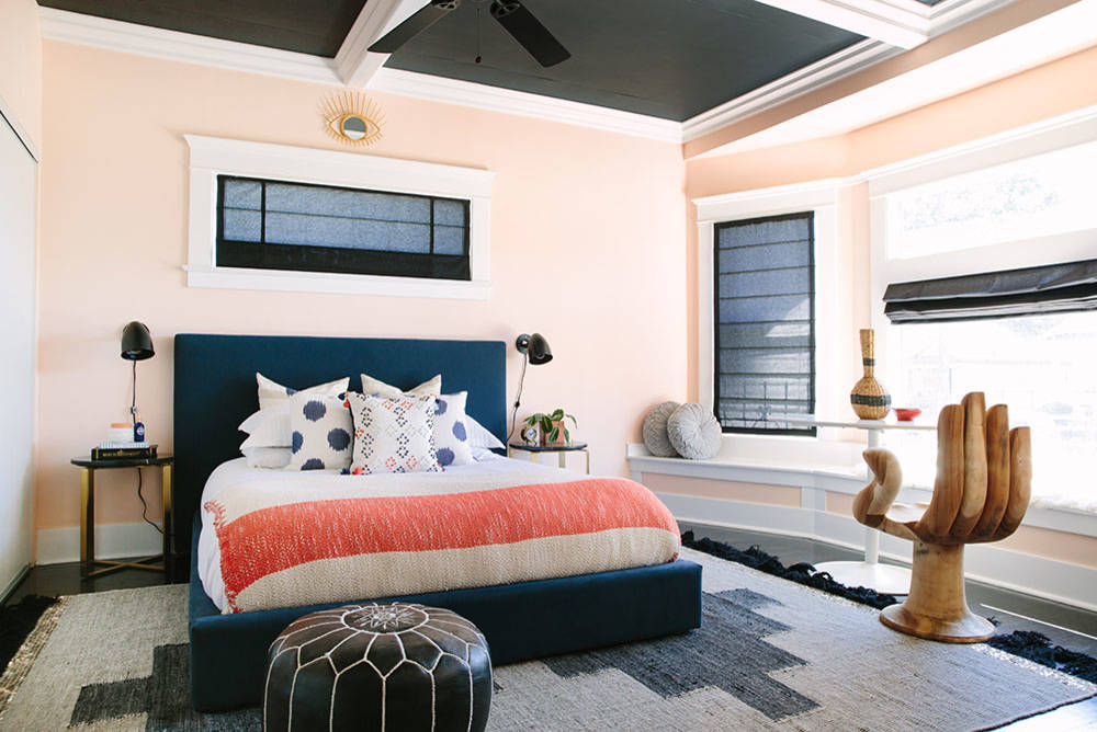 4. Do let it soothe you. There’s a strong contrast between the dark furniture and the vast ceiling in this bedroom, and warm peach walls serve as a calming mediator between the two.