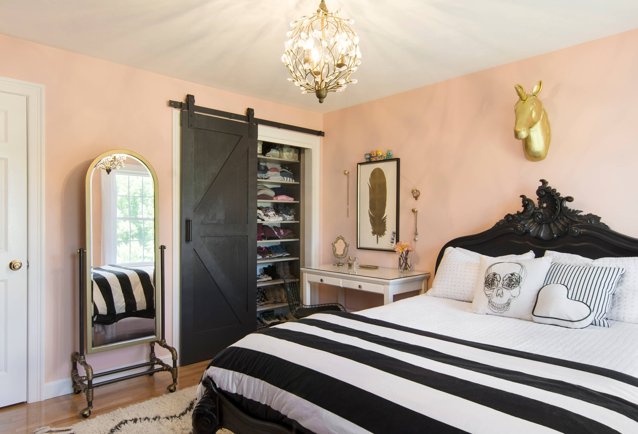 6. Do think Old Hollywood. The palette of black, white, peach and gold is a nod to a bygone glam era in this bedroom. Interior designer Gabrielle Lazaros of Kelly McGuill Home chose a salmon peach for the walls. “It works well because it is not so pink but still gives off the feminine playfulness,” she says.