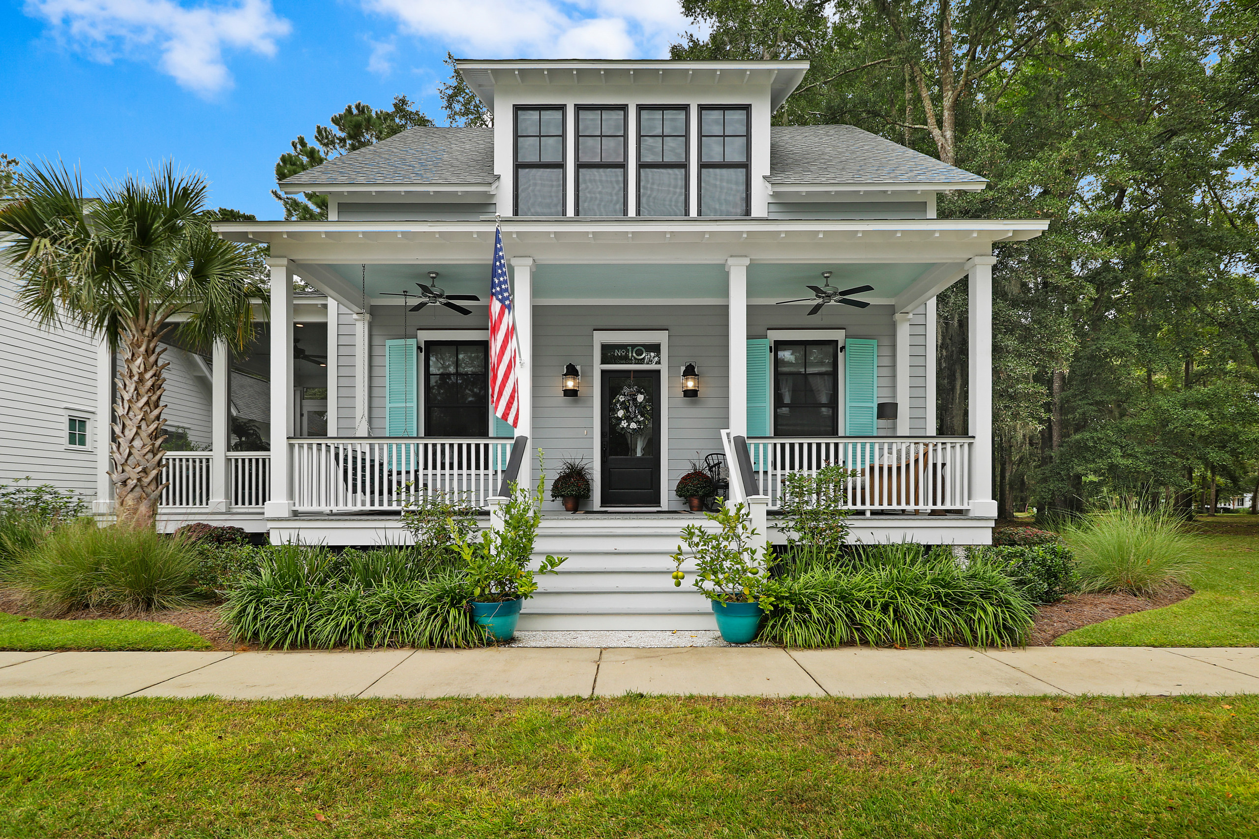 This coastal home in Habersham, South Carolina, features a neutral gray shade selected to complement the custom light blue window shutters and porch ceiling. “This gray can read dark and stormy or light and nautical depending on the natural light and season,” says Jodie Miller of Allen Patterson Builders.