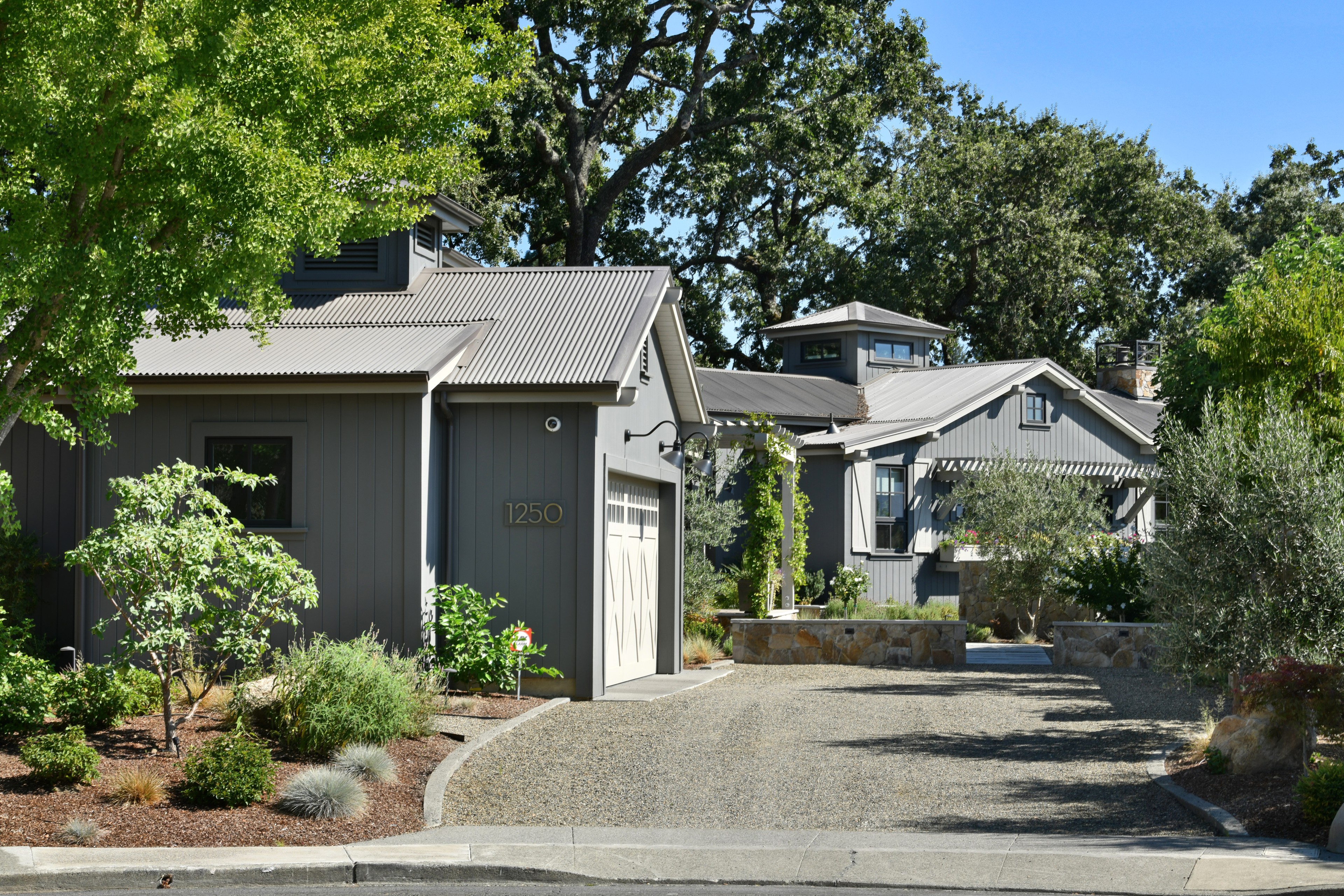 The warm shade of gray that covers the exterior of this modern farmhouse in St. Helena, California, picks up the brown tones of the surrounding trees and connects to the roofing material. “The color is pushed further to the warm side by the bronze patina of the corrugated metal roof,” says architect James McCalligan.