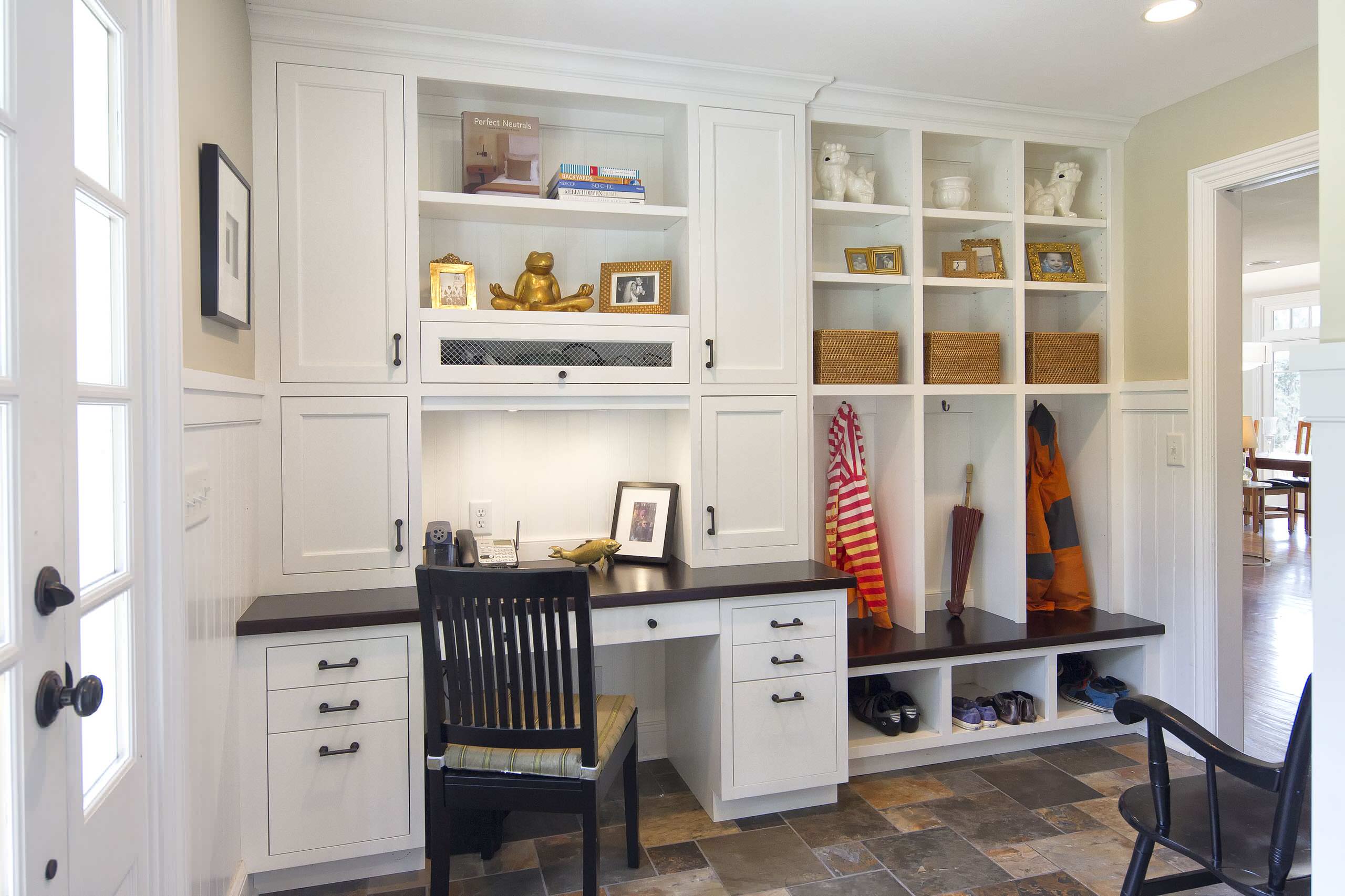 Office space. Transform your mudroom into a double-function space with a built-in desk and file storage. One wall is all you need if you plan it right. The cubbies and hooks help keep outdoor gear and clutter separated from the desk area.