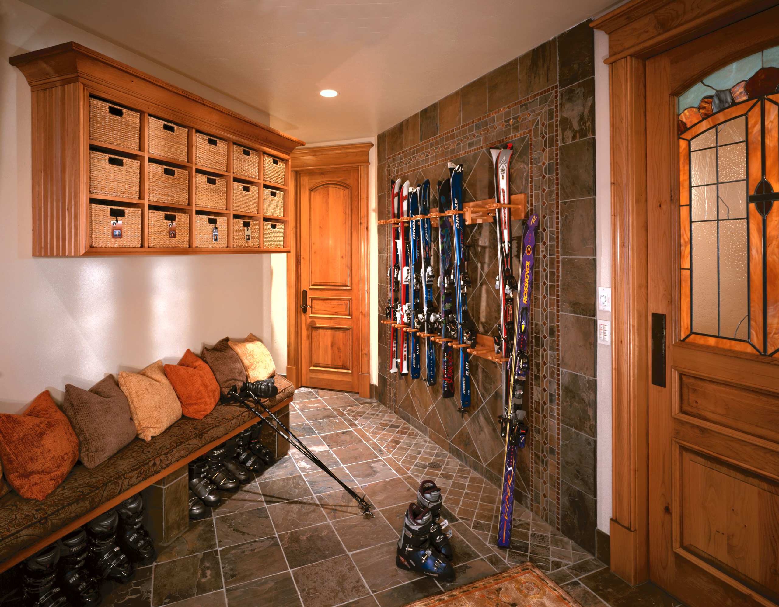 Seasonal storage. Mudrooms can be the perfect place in which to store outdoor sports gear for all four seasons, with the right organizational techniques. This ski-loving family came up with a great solution to keep their winter gear under control: Cubbies for gloves and hats up top, spots for boots below the bench and custom ski racks keep everything neat and tidy.