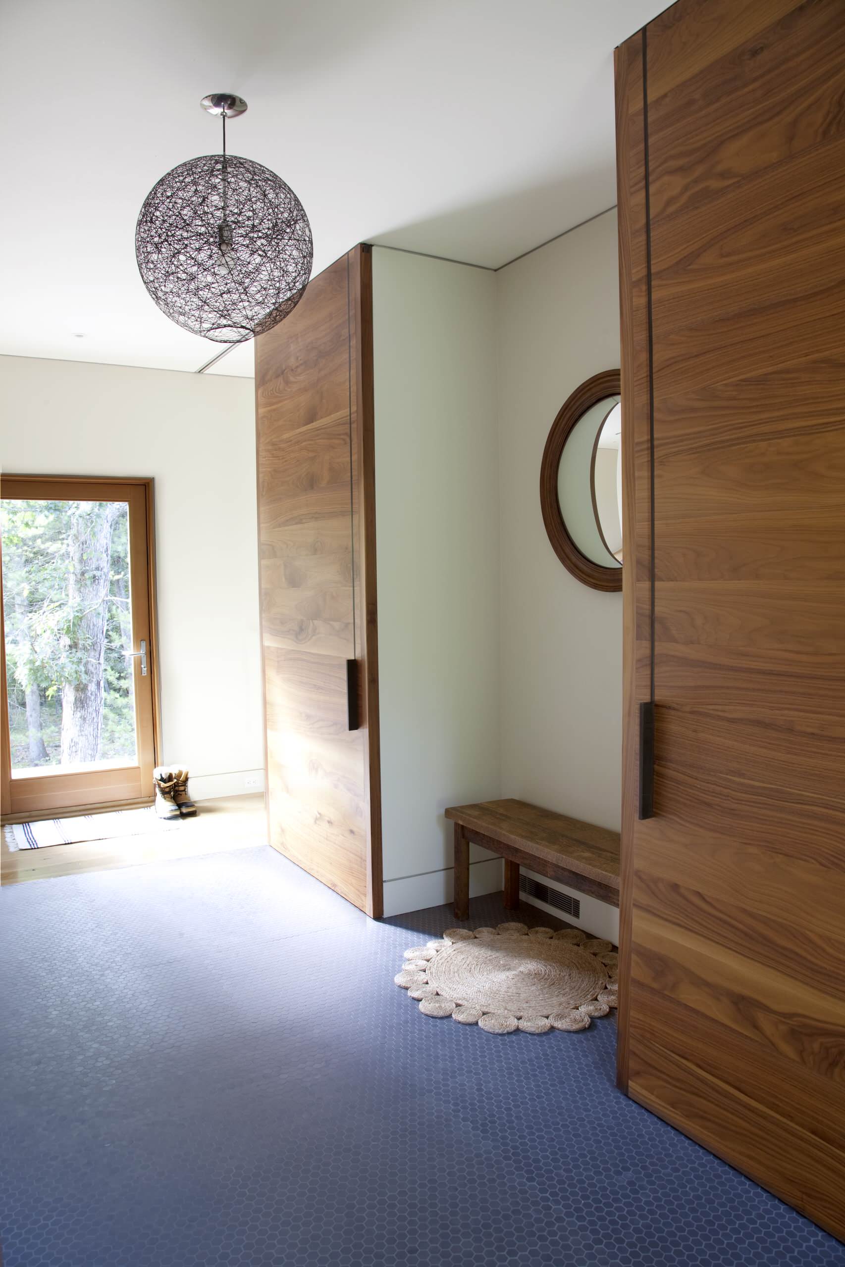 Neat and clean. Not all of us like to have our jackets and coats on display. These floor-to-ceiling cabinet doors keep clutter out of sight and add an architectural statement.