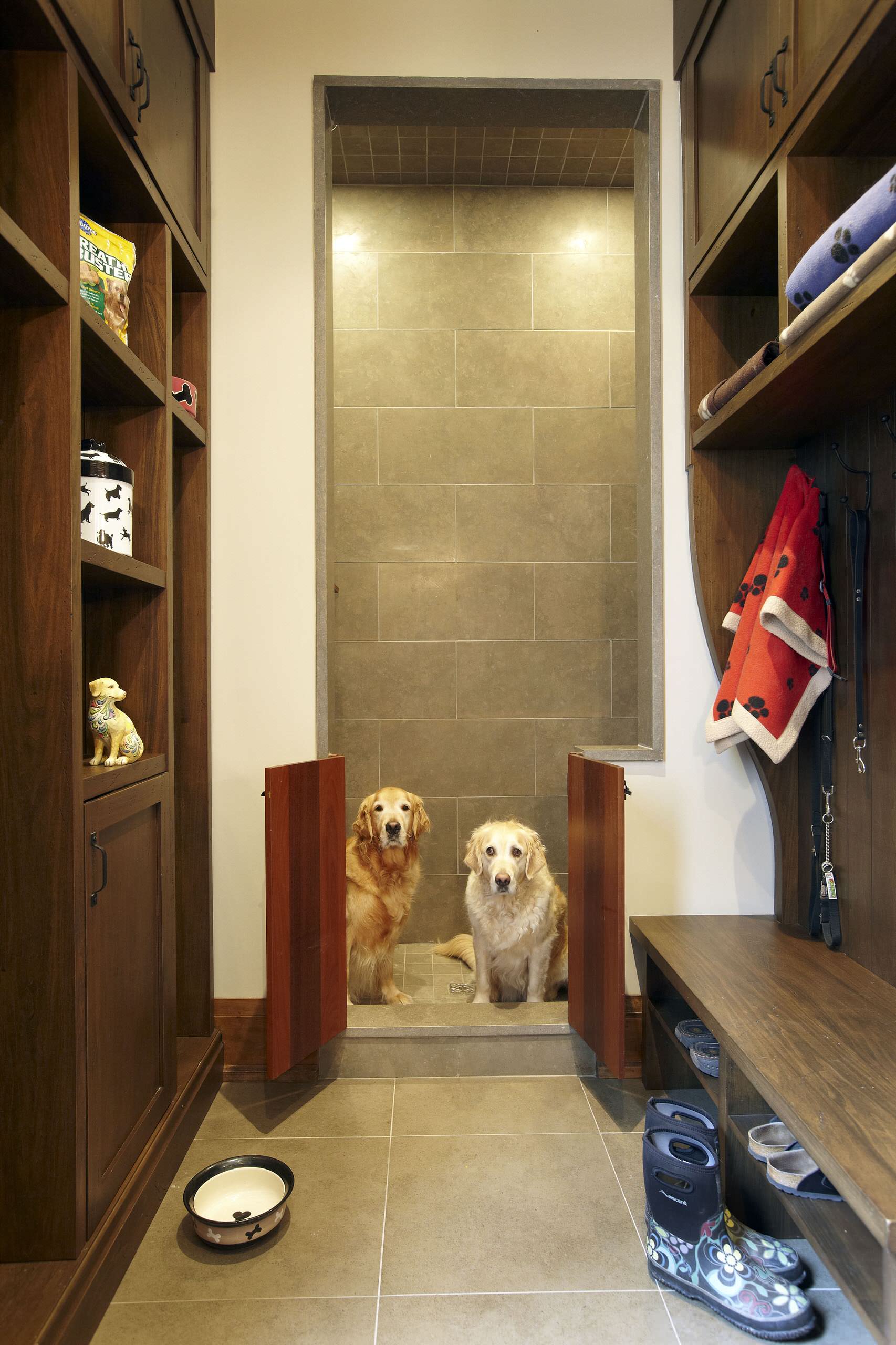 Pet station. If you share your home with furry friends, your mudroom is the perfect place for a doggie stop. This pet-friendly mudroom's special space for cleaning pets means the owners will never see a muddy paw print in their house again. A sophisticated palette of durable materials makes it feel sleek, despite its practical purpose.