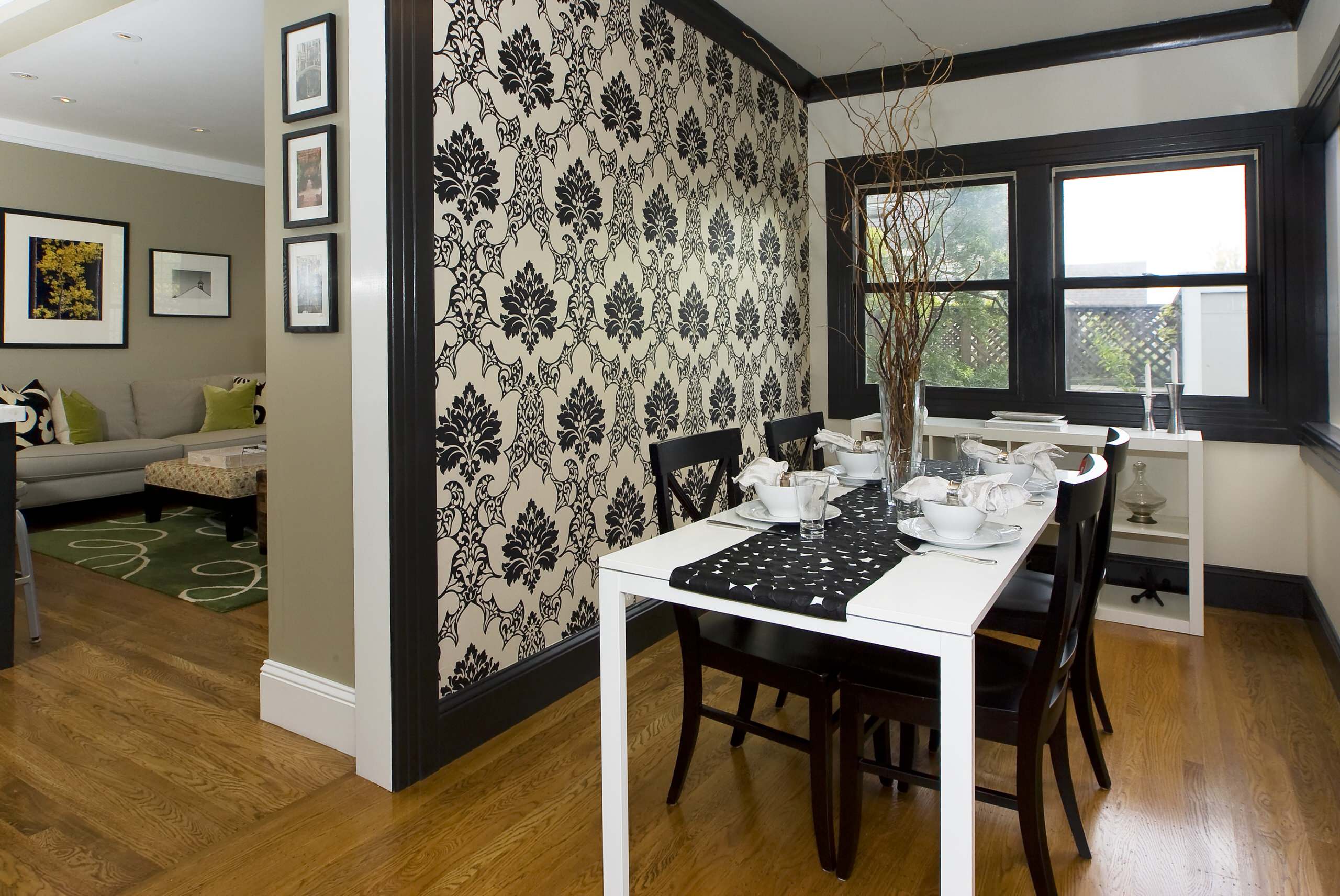 2. Push over-the-top wallpaper. Designer Shelly Amoroso loves using black trim to outline a focal point, like the wall covered in graphic wallpaper shown here. “It really makes it pop out,” she says.