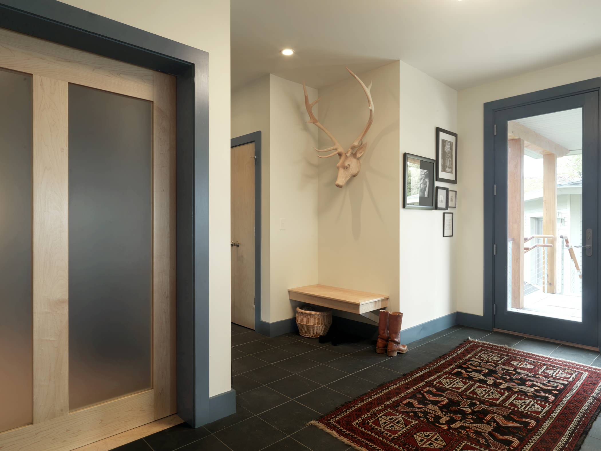 The downside is that you’ll lose the textural and sculptural aspect of the window mullions at night, because the darkness blends in with the blackness of the window pane. Also, be cautious with this approach. It’s probably best for north-facing rooms and homes, because “dark trim fights against a sun-filled room,” Martin says.