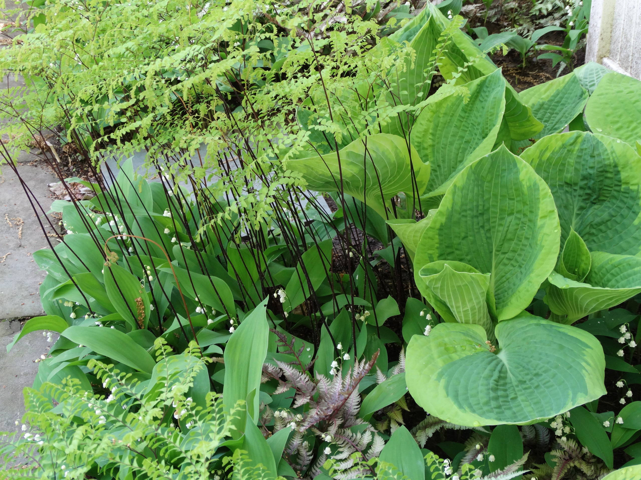 5. Cool tones. Colors in the green, blue and purple spectrum are considered cool colors. Cool colors evoke a sense of calm and freshness. They help us feel relaxed and peaceful. Note how the purple of the Japanese painted fern picks up on the dark stems of the maiden fern, and the tiny bell-shaped flowers of the lily-of-the-valley dance throughout the planting. Delicate and wispy mix beautifully with bold in this enchanting New York garden.