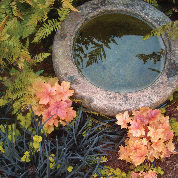 6. Warm tones. Colors on the yellow, orange and red end of the spectrum elicit a sense of vibrancy and energy. The vivid color of these ‘Southern Comfort’ coral bells draws attention to the water feature in this San Francisco garden.