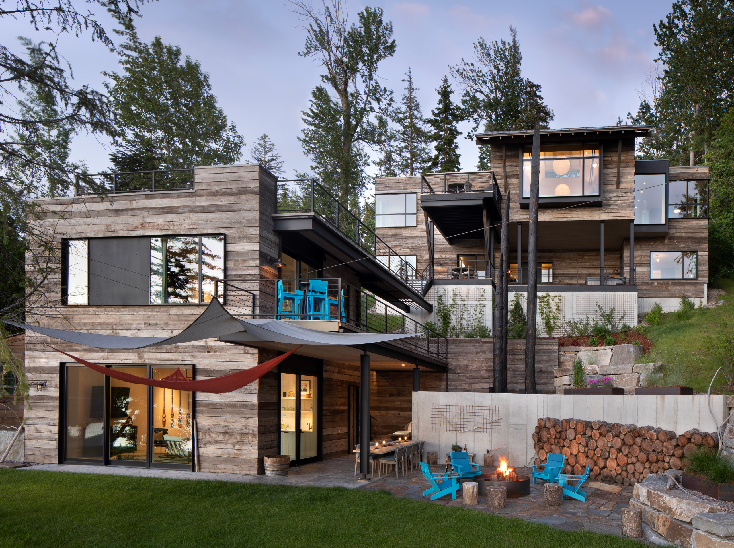This expansive new-build Montana home and guesthouse offer several opportunities to view beautiful Flathead Lake from different vantage points. (This photo was taken from the edge of the lake.) Pearson Design Group created multiple underdeck areas for dining and hanging out, with blue chairs adding splashes of bright color and creating a connected feel.