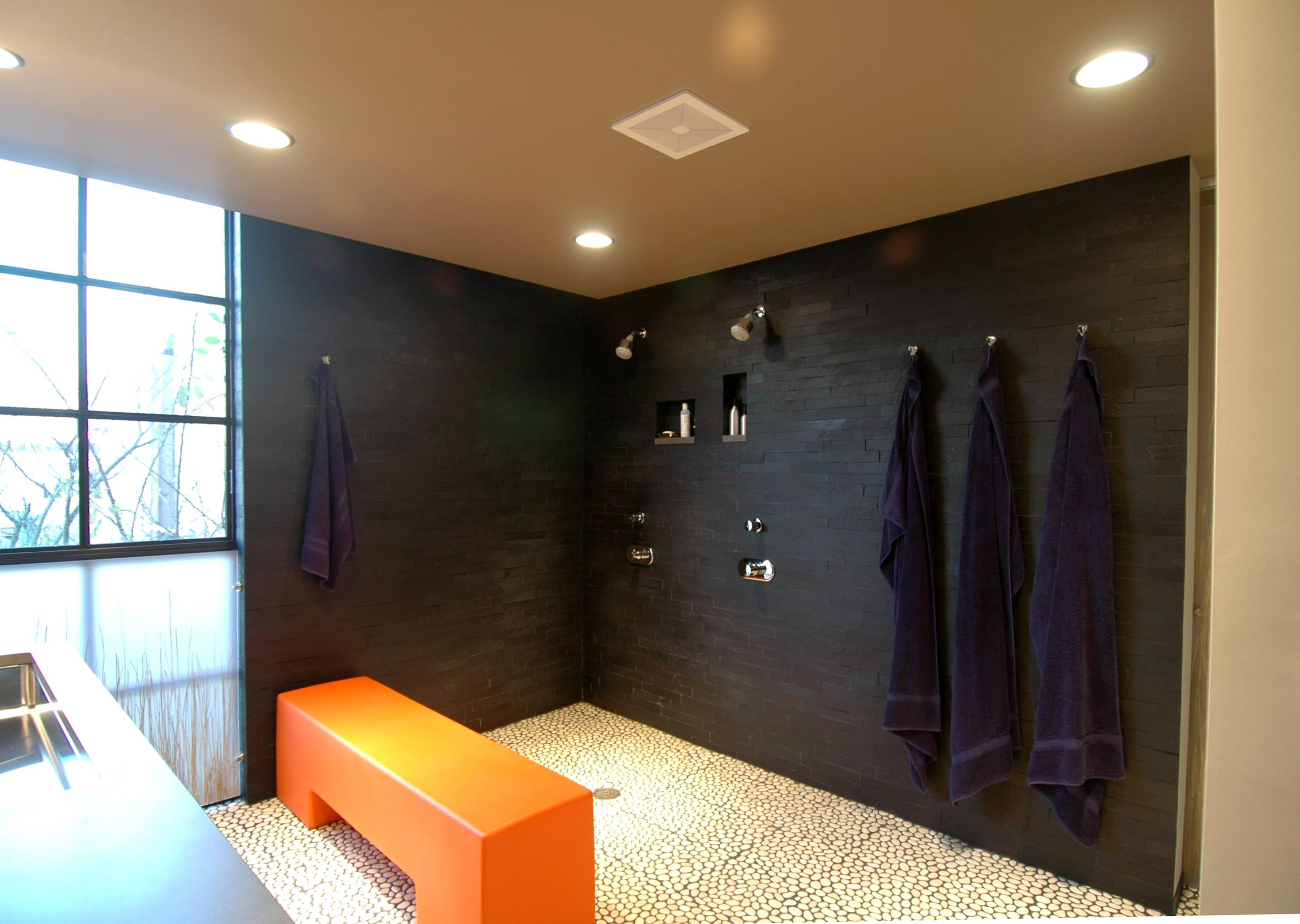 6. Provide a place to sit. If the space is large enough, outdoor furniture (benches, stools, etc.) are a perfect way to replace the built-in bench found in a traditional shower. What to say about this wet room? It’s absolutely stunning! The pebble floor, stone mosaic walls in the wet zone and that fire-orange bench set it all off.