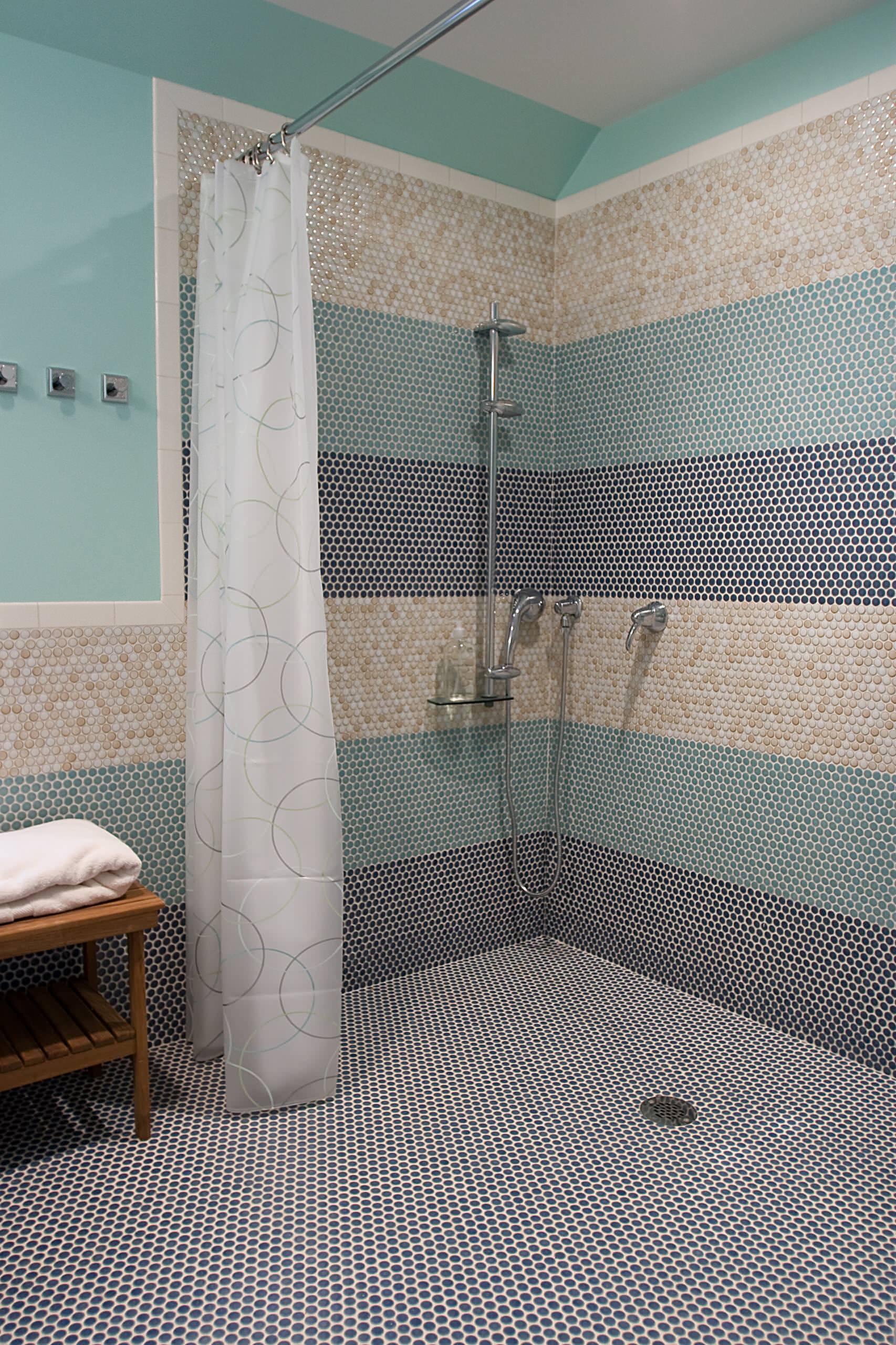 Have fun in your selection of pattern and color. A wet room is already unusual, why not have fun with it?