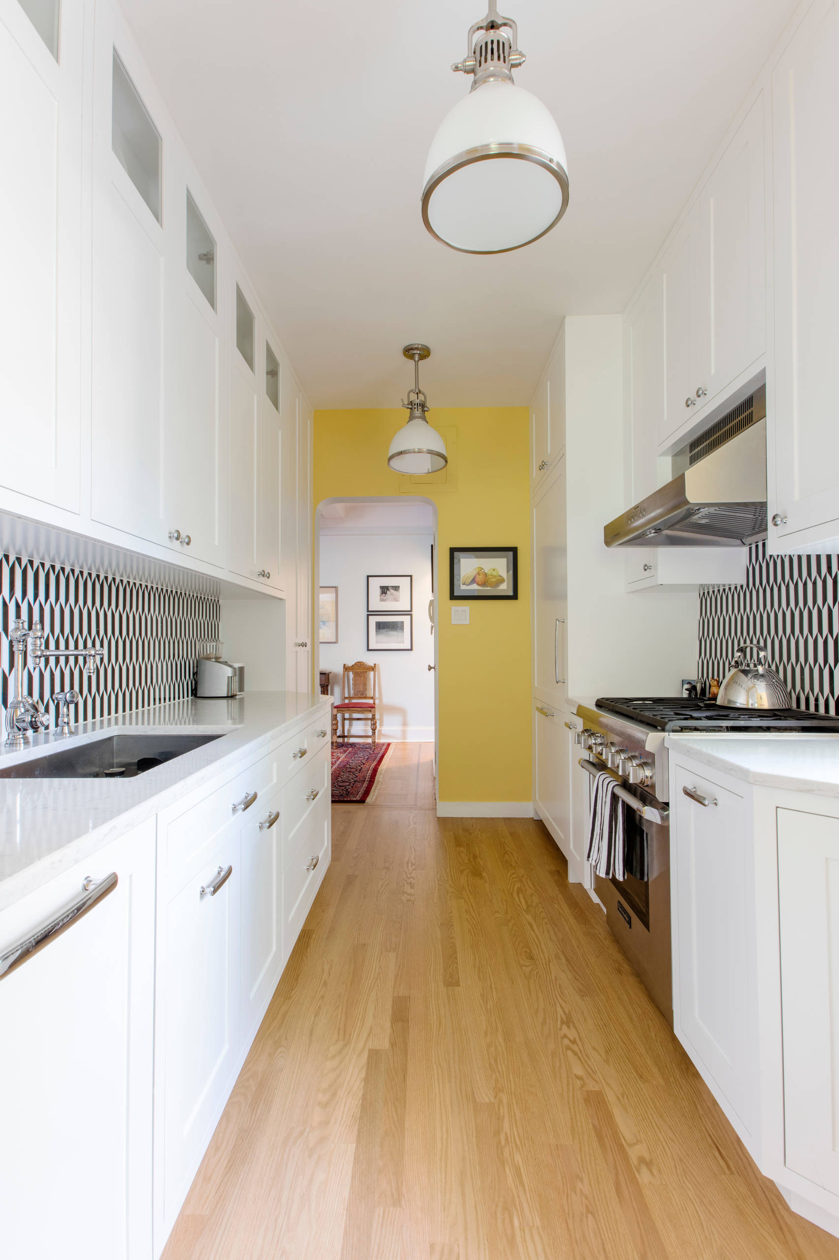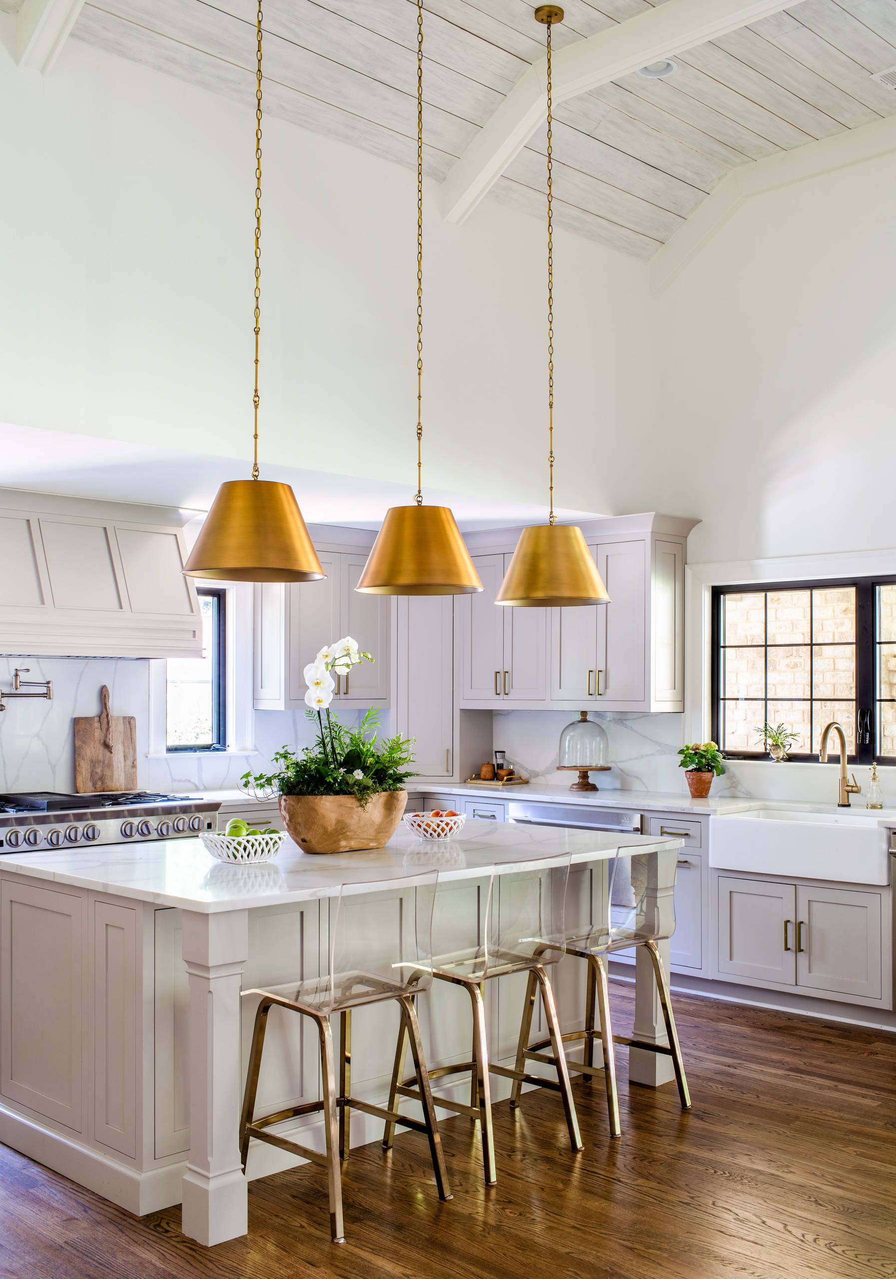 These gold pendants lend a tasteful touch of glamour to a mostly white kitchen. The gold cabinet pulls, oven knobs and sink faucet coordinate with the lighting finish to give the kitchen unmistakable style.