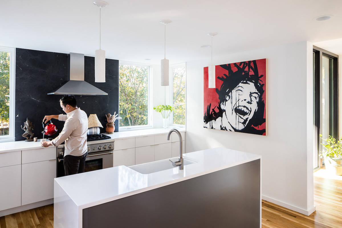 In this kitchen, the high contrast between two neutrals — white on the upper cabinets and black on the lower cabinets, range hood and window frames — creates a tension that also helps make the room interesting.