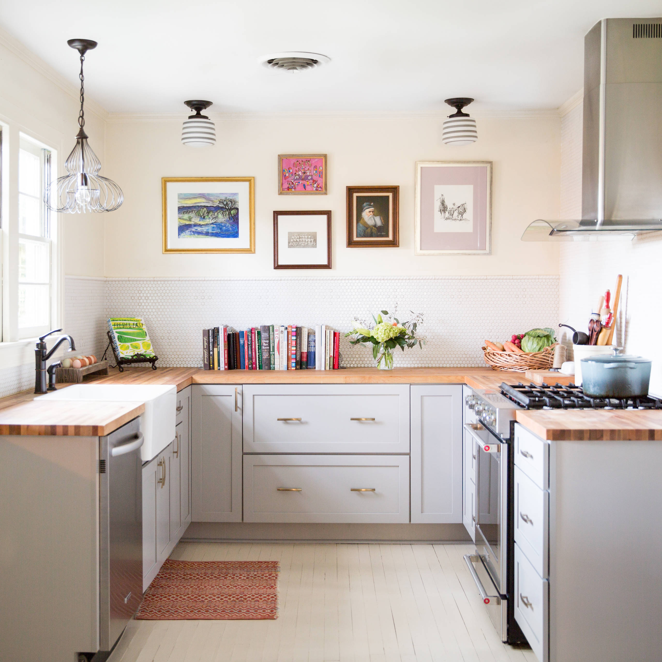A gallery wall brings personalized style to a kitchen from Folkway Design & Wares that has neutral cabinets, countertops, flooring and walls.
