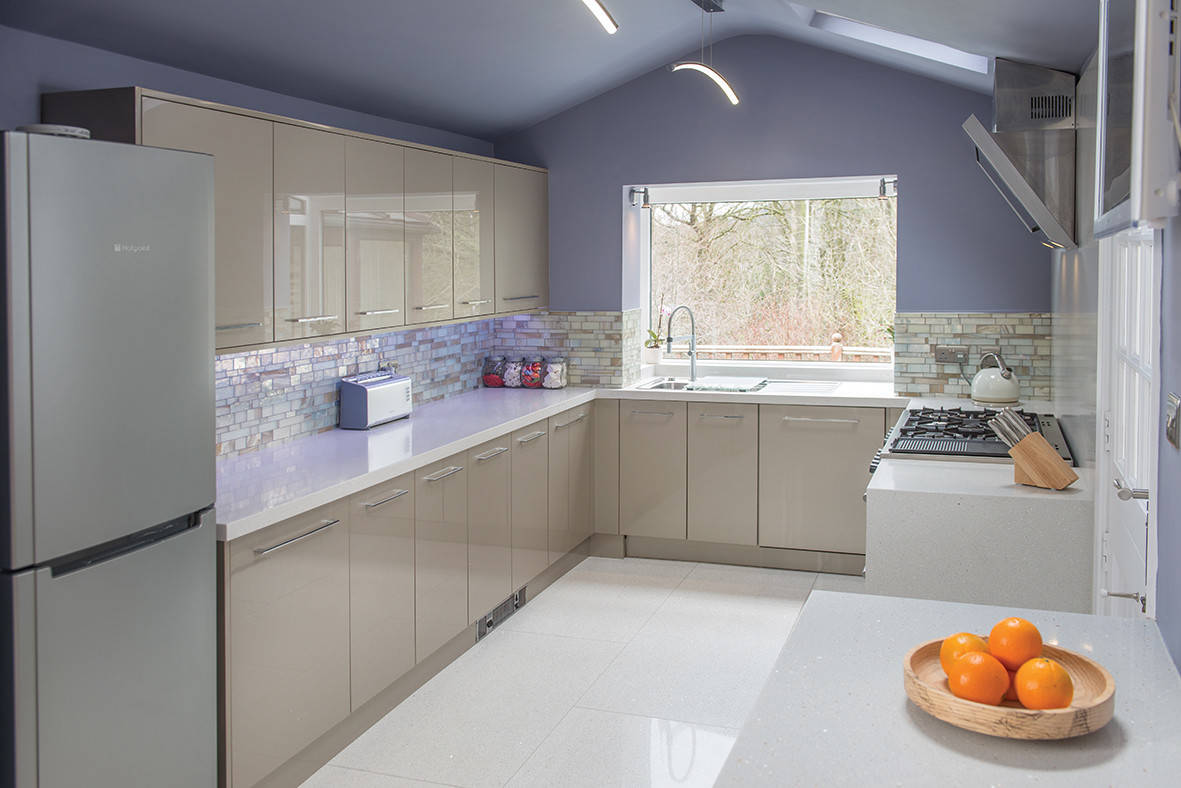 In this kitchen, a pretty lavender coats the walls and ceiling. The shade is a surprising and refreshing companion to the taupe cabinets. With the light hitting the shimmery backsplash, it nicely reflects the purple hue.
