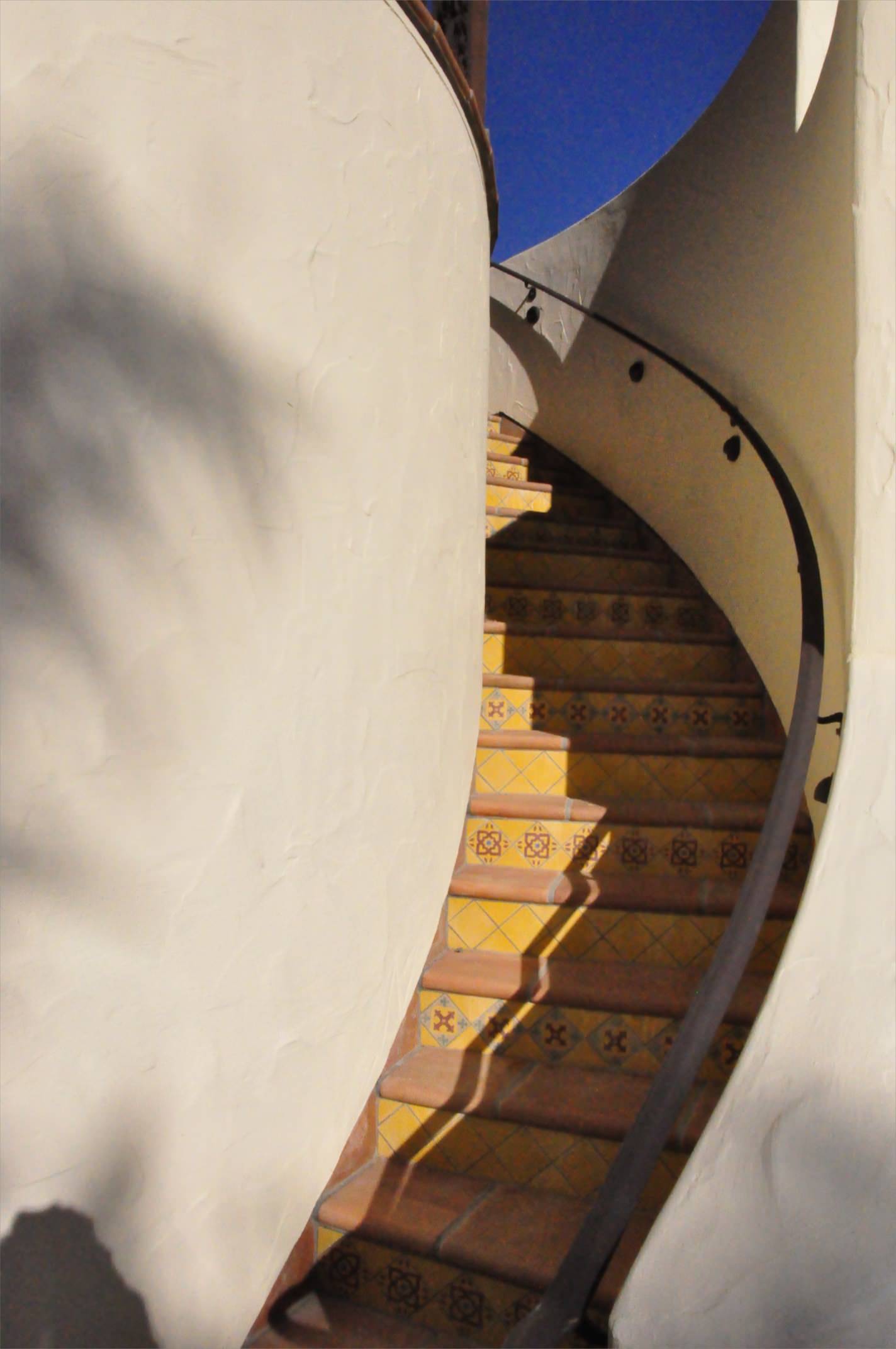 3. Painted tile. Here, a beautifully curved staircase reveals another classic feature: handpainted tiles on the stair risers.