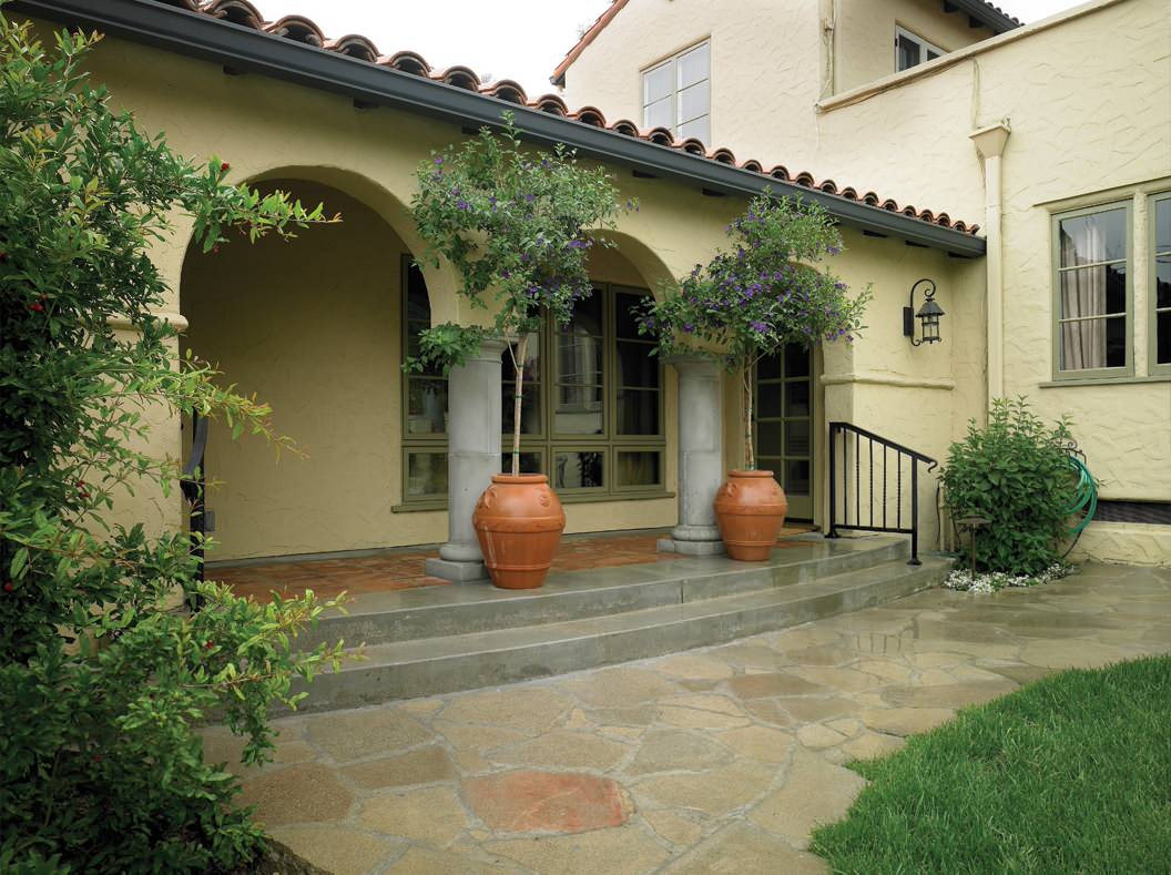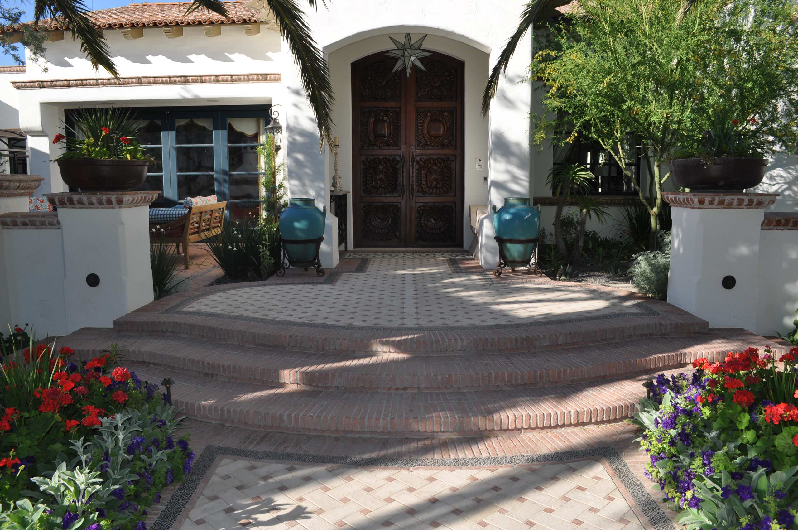 1. Curves and arches. Here, curved steps lead to a graceful archway to the front door.