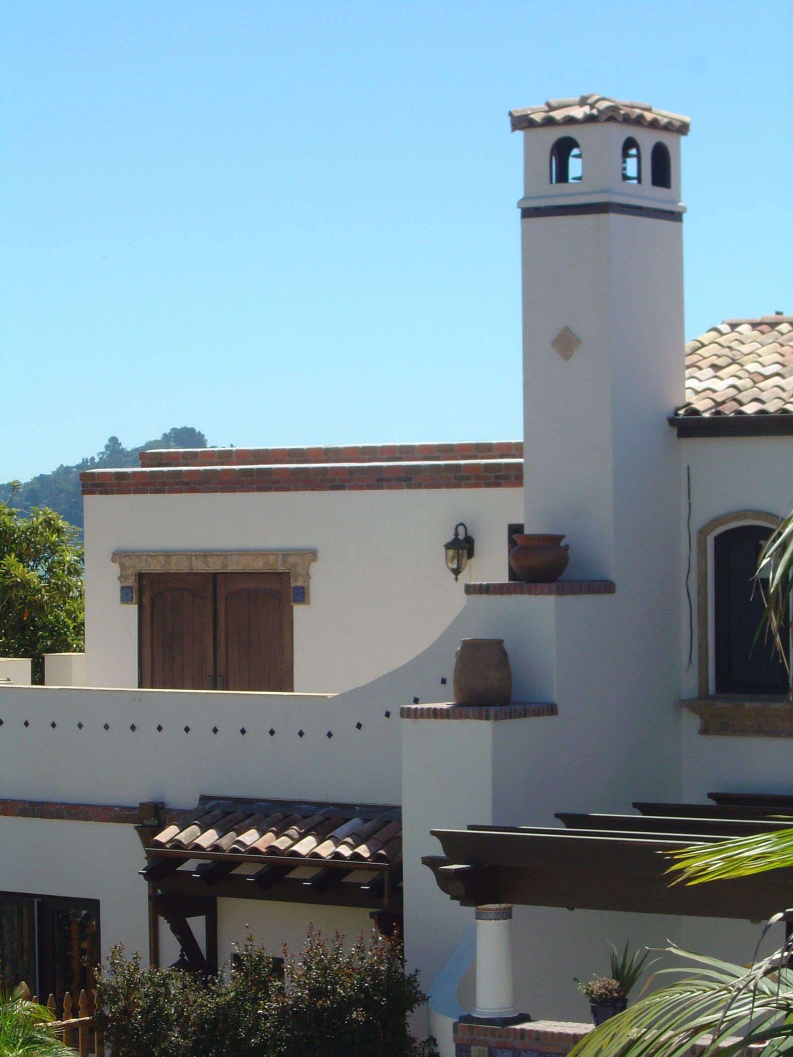 4. Terracotta roof tiles. The red clay roof tops give the homes a warm, earthy, rustic look. Often the roof lines are multi-level to create interest and asymmetry. This home features a turret.