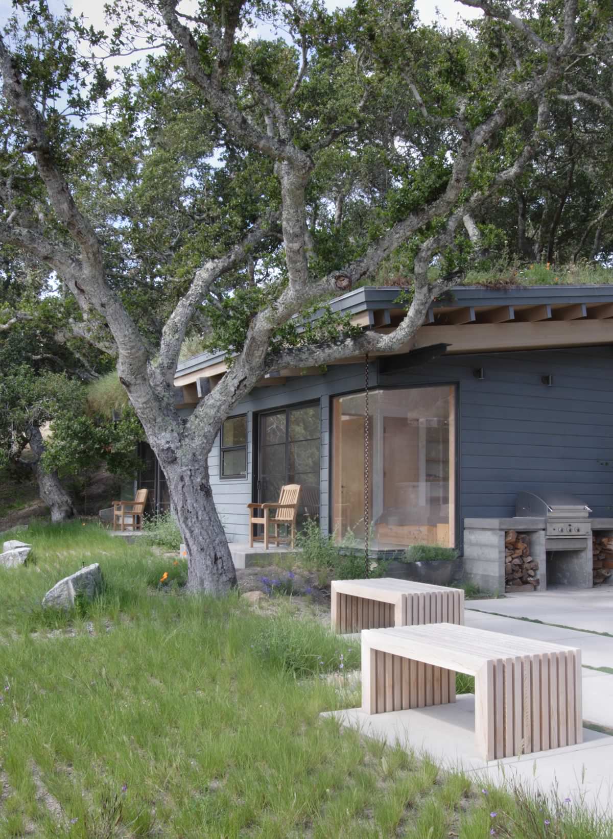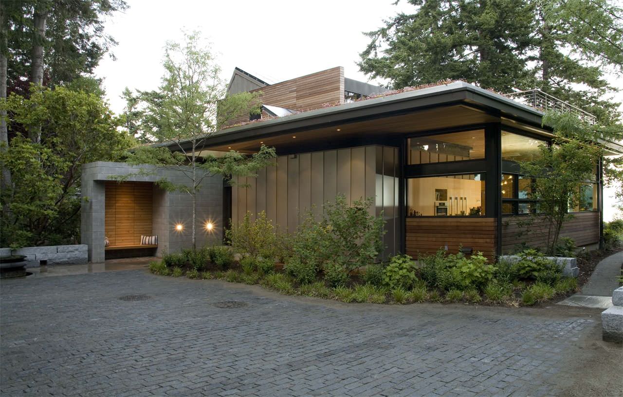 The last few examples all come from Feldman Architecture. They illustrate the variety that can come from one designer (and the landscape consultant) when dealing with the unique circumstances of each client. This first house is one of the few sloping green roofs in Houzz. A closer look ...