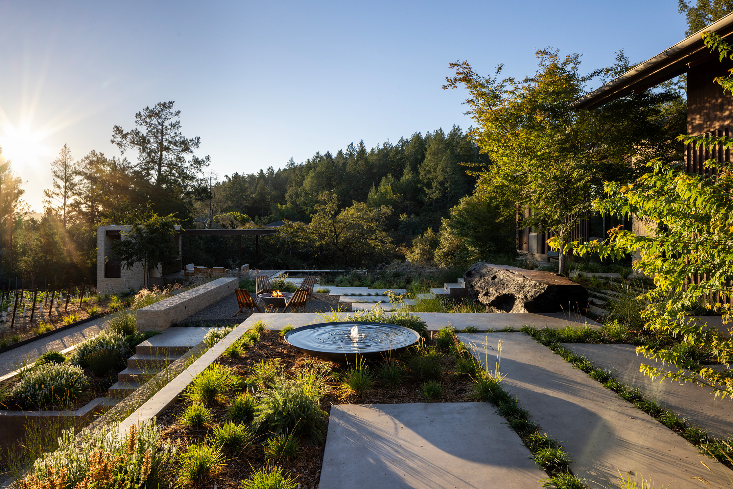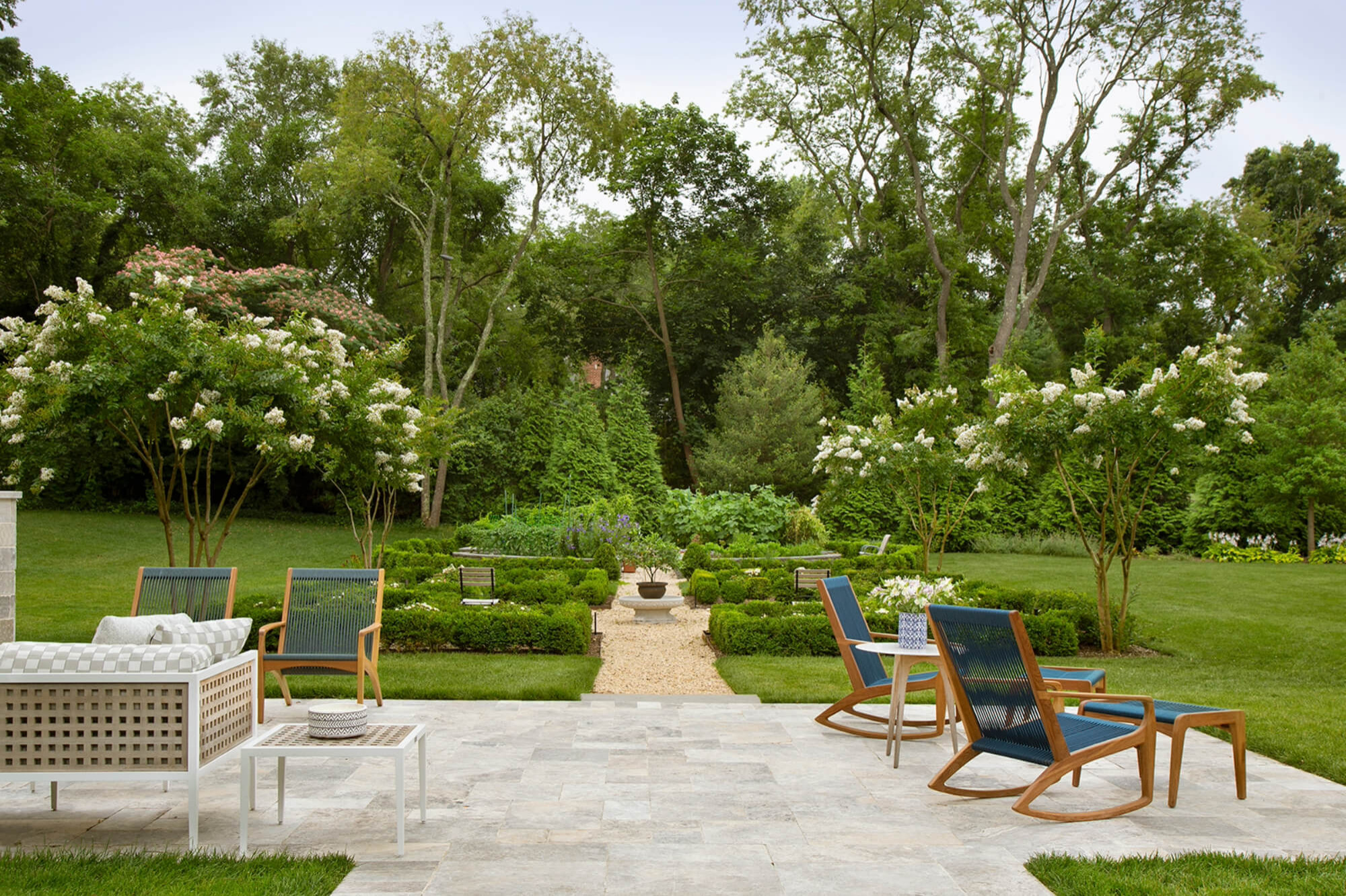 Larger pieces — like an outdoor table and chairs, a fountain, a fire feature or a specimen tree — work well set at a greater distance from the viewer. These types of elements seen from indoors draw one’s gaze deeper into the landscape.