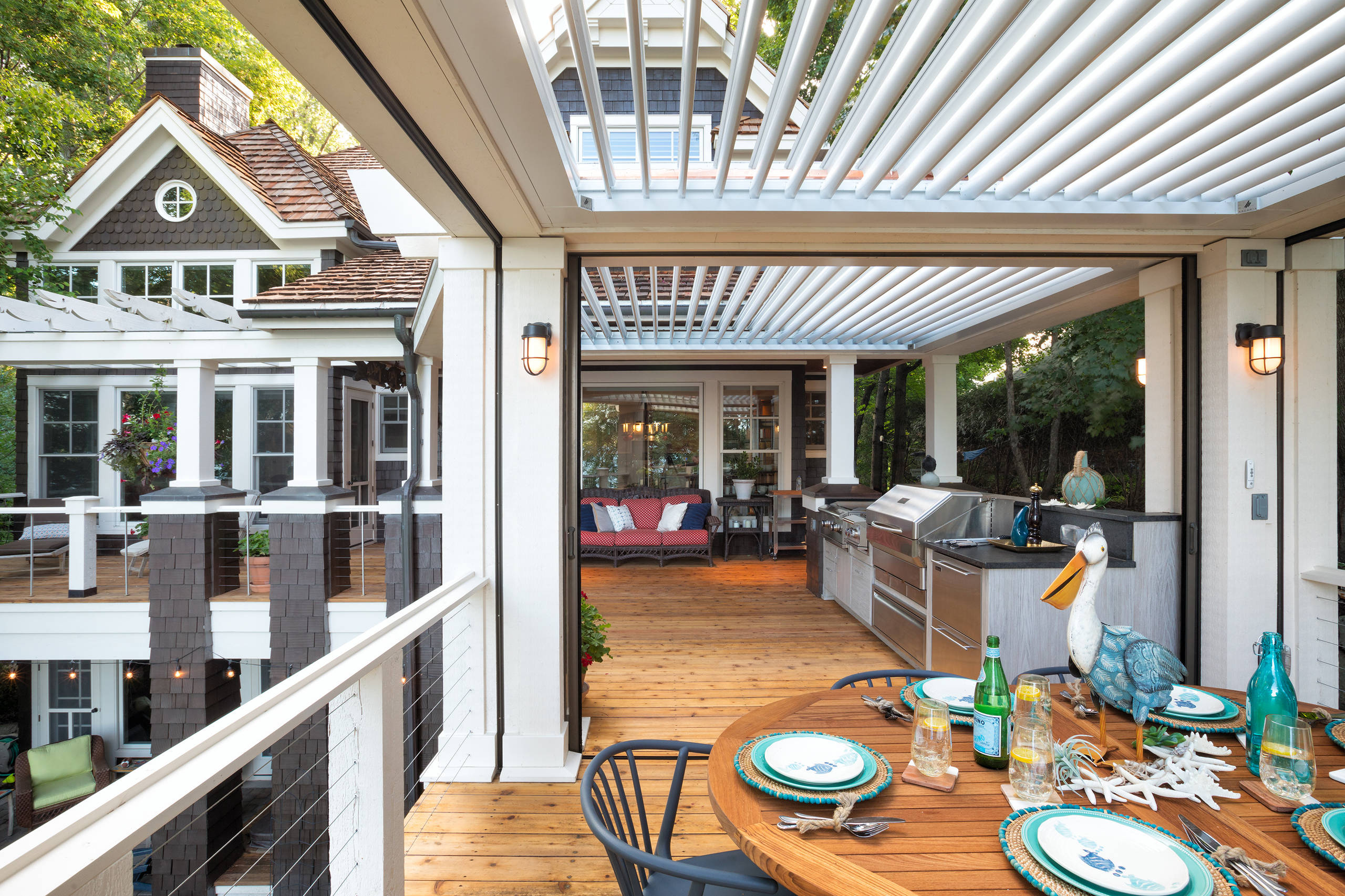 There’s more than what meets the eye with this elevated deck on the shores of Lake Minnetonka, in Minnesota. All sides of the deck, designed by Sharratt Design & Co. and Karie Zemlicka from Mom’s Design Build, can be screened in with the touch of a button, thanks to integrated retractable screens by Phantom Screens. This option ensures that summer dinners can be enjoyed bug-free.