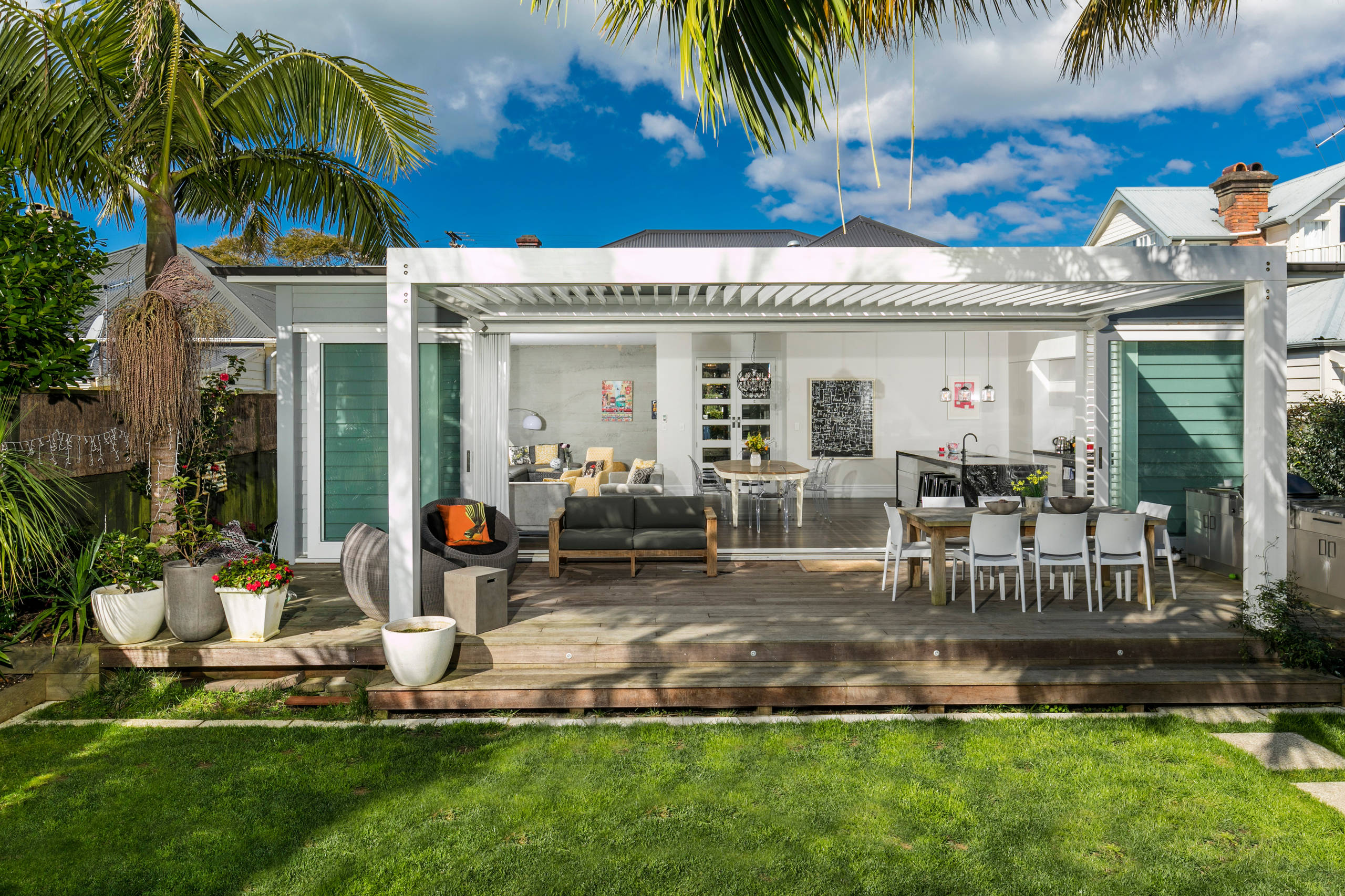 A streamlined pergola extends from the home’s roof to enclose this indoor-outdoor dining room by Designworx New Zealand on New Zealand’s North Island. With the large sliding glass doors open and the curtains pushed aside, the home’s interior and outdoor deck flow together nearly seamlessly.