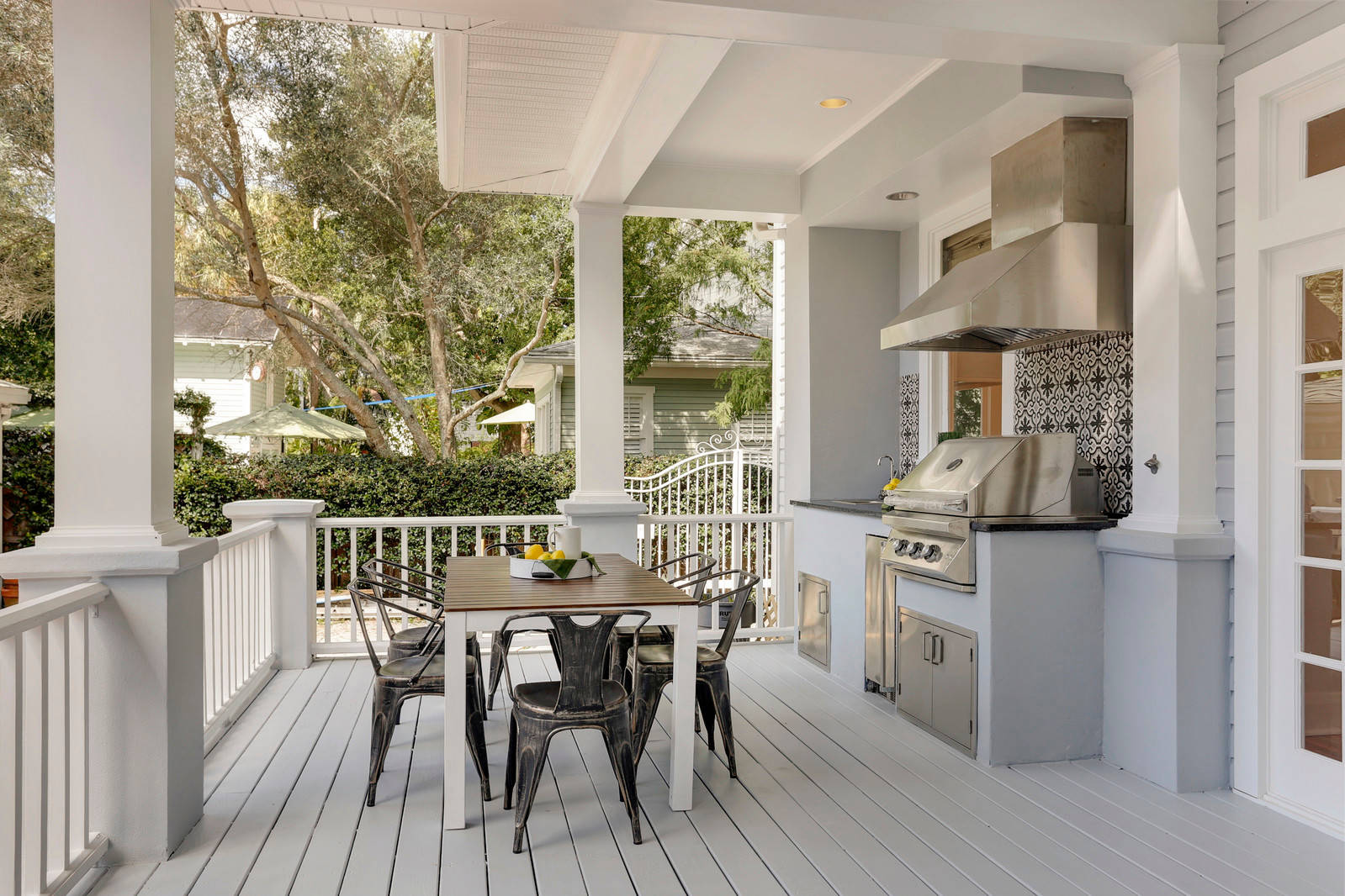 Debra Ackerbloom Interiors transformed a simple porch off the back of a house in Tampa, Florida, into an outdoor cooking and dining area. The new outdoor kitchen — complete with grill, sink, fridge and encaustic tile backsplash — brings the action outside. Hot dishes can be easily served up on the adjacent dining table, which overlooks the backyard and pool.