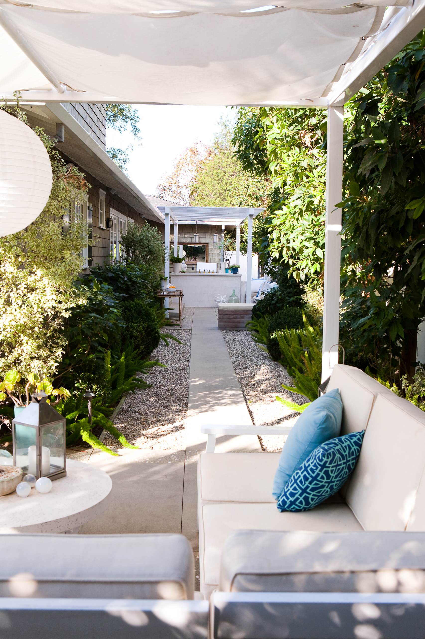 This compact home in San Diego takes full advantage of its exterior space. Brookside Design helped transform the side yard into a spacious outdoor living area, complete with kitchen, lounge and dining spot. The calming gray, blue and white color palette ties in with the house colors and keeps the small space from feeling cluttered.