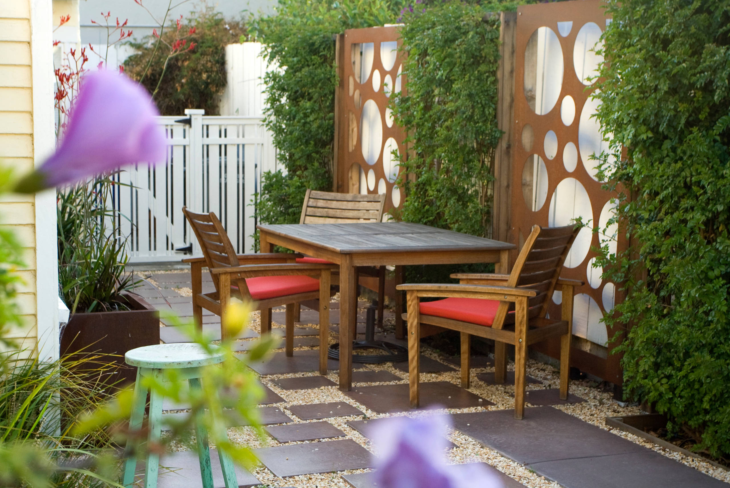 Leafy vines and decorative metal screens turn property fences into a design feature in this side yard seating area by Shades of Green Landscape Architecture. The design also features uplights at the base of each screen that illuminate them at night and create a pleasant ambiance for the outdoor dining table.