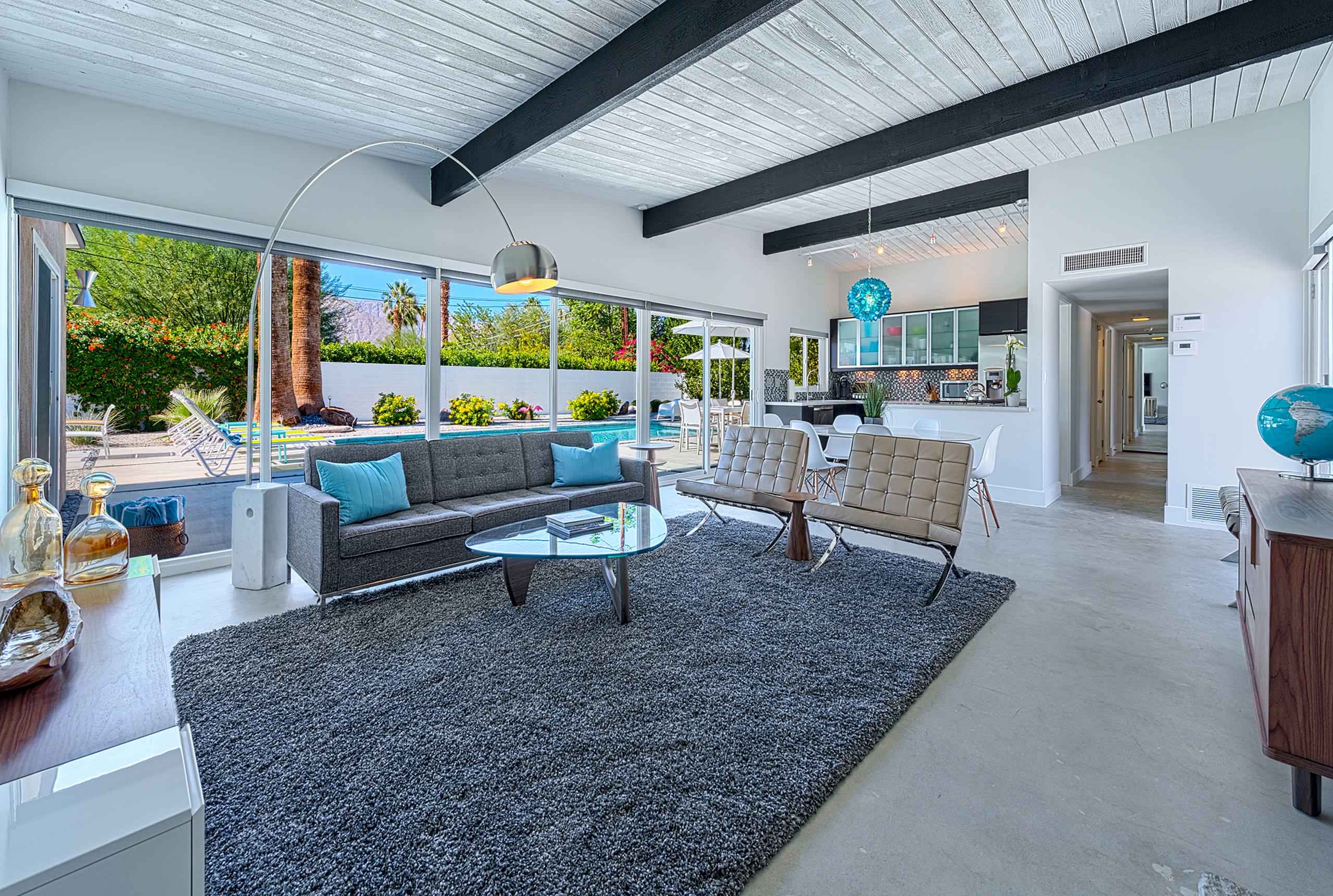 8. Ceiling accents. The ceiling can also be effective for breaking up a room without a full dropped panel. A simple beam or bulkhead draws a line across the room (one that you can’t trip on). For example, here, even though the furniture plan sprawls across the room to allow for a flexible number of guests, the area around the fireplace still feels structured and orderly, thanks in part to the subtle division of the ceiling.