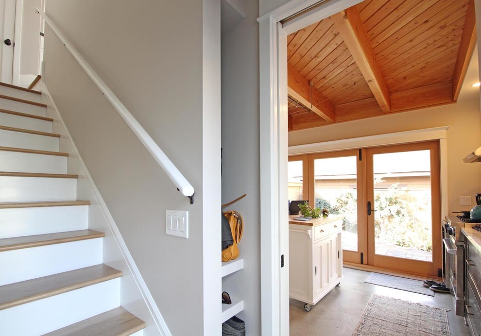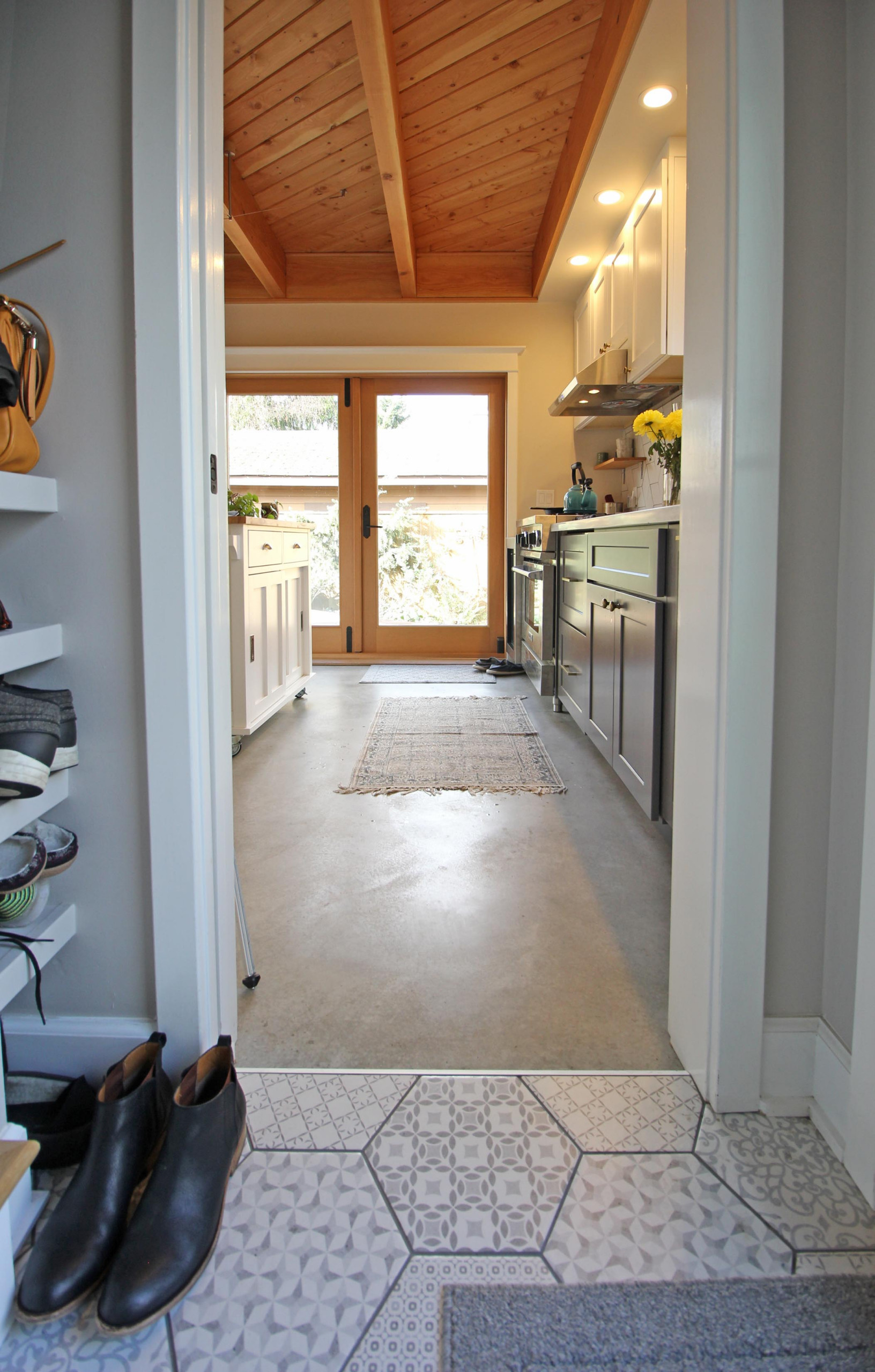 The front door seen in the previous photo leads to this entry, originally intended to serve as a private entry for renters. The doorway just past the shelves contains a pocket door that can seal off the rental unit from the rest of the cottage, but because the property owner and his partner decided to move in themselves, the pocket door stays open. The door keeps things flexible should the homeowner ever want to use the ADU differently in the future.