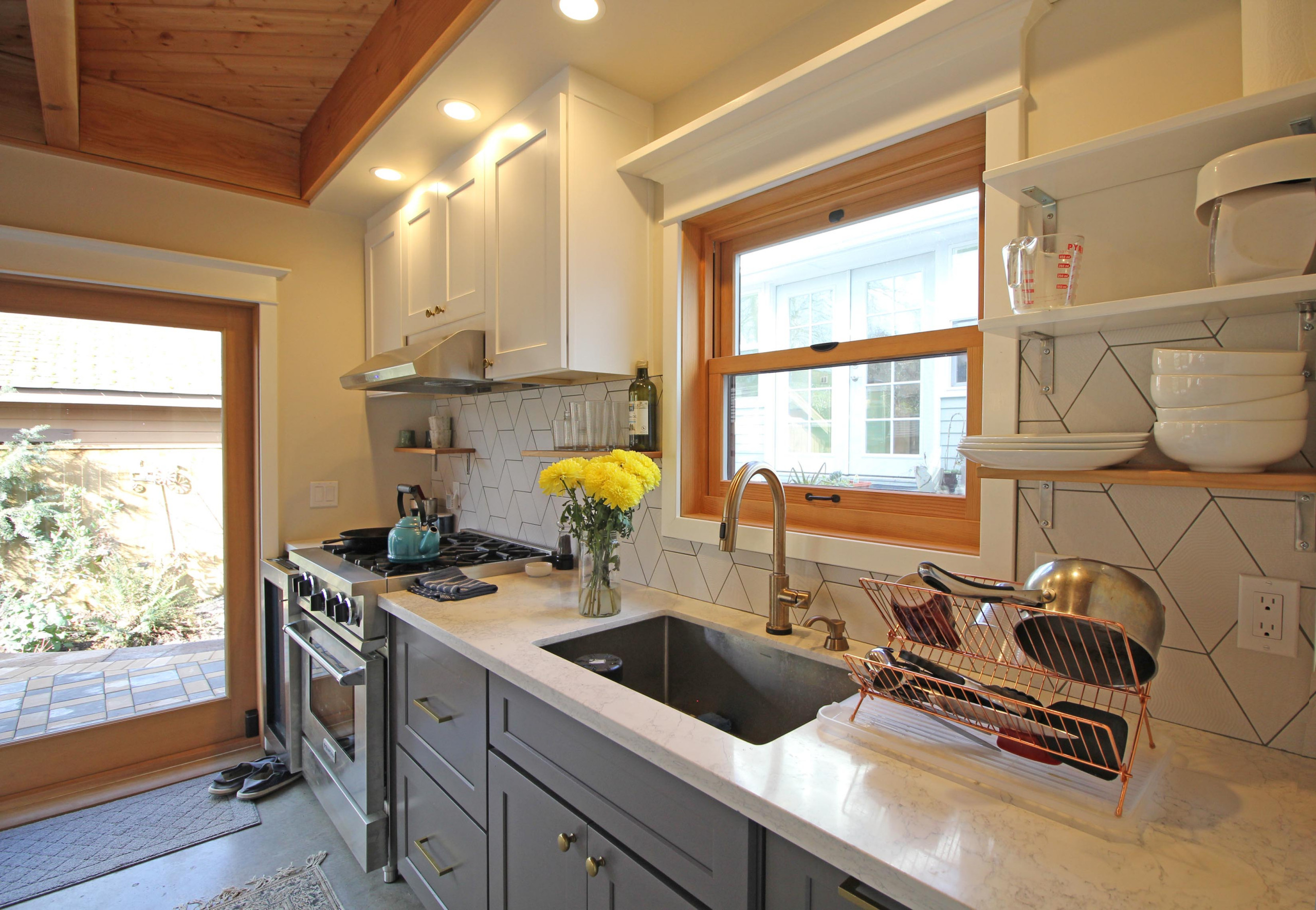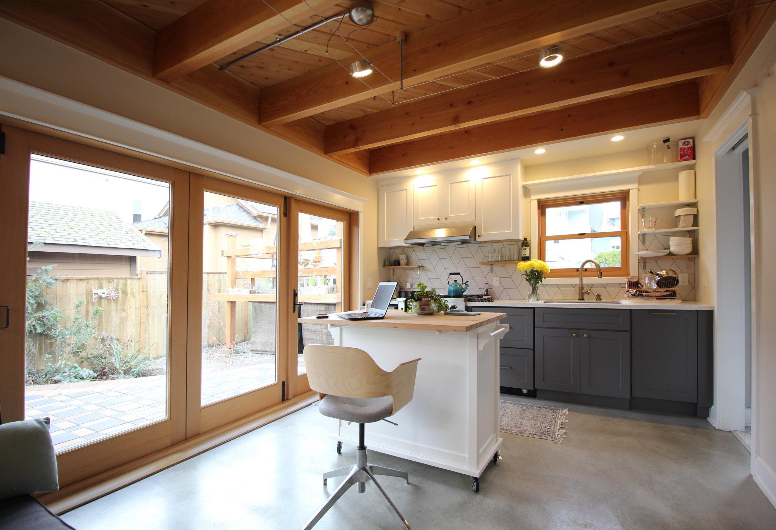 Those fancier finishes include Douglas-fir-trimmed windows and accordion doors. “They really wanted this wall to open up, and these doors were a splurge,” Parker says. The patio contains a fire pit, a grill, a potting station and a small rain garden. The doors allow the living space to continue seamlessly out to the patio. The couple and their friends who rent the main house enjoy gathering out there. “This group is really social,” Parker says.