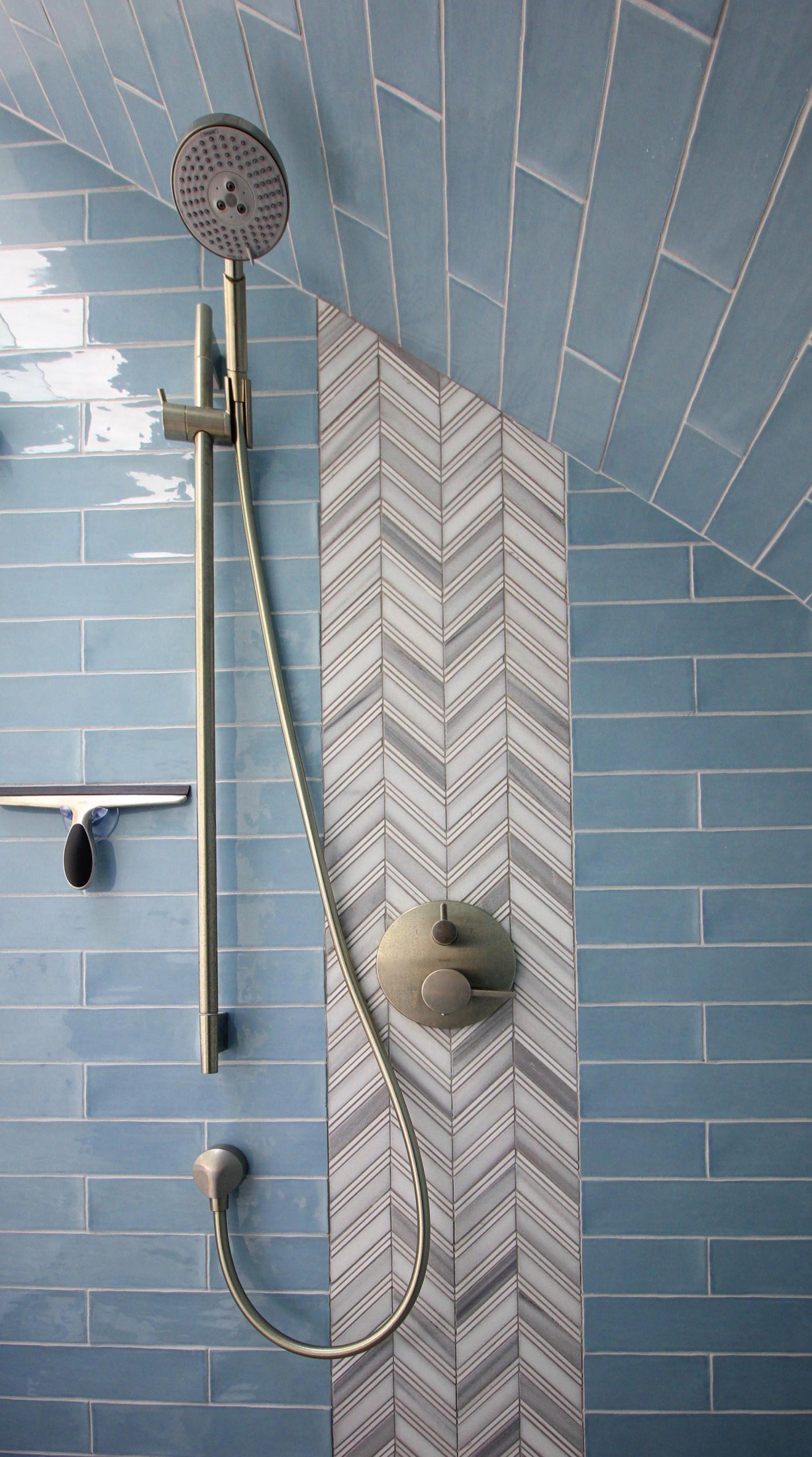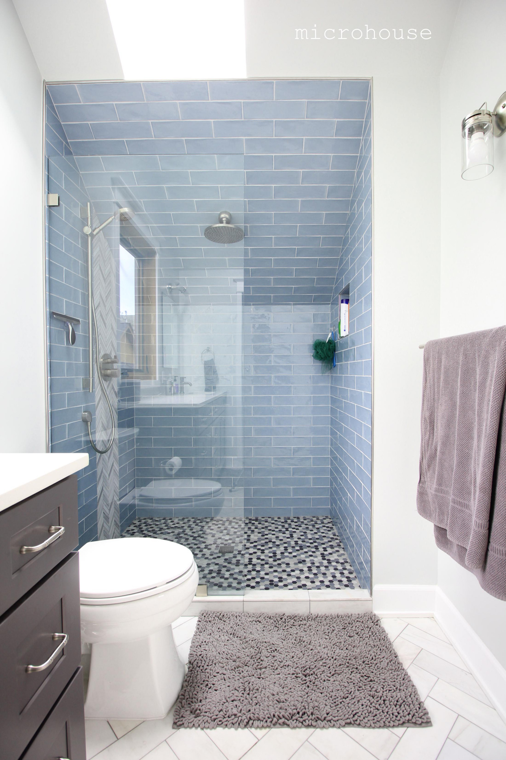 Forgoing a tub in the bathroom meant there was room for a larger shower stall. Elongated watery blue subway tiles give the stall a relaxing feel. A clear glass panel keeps the view into the shower open.