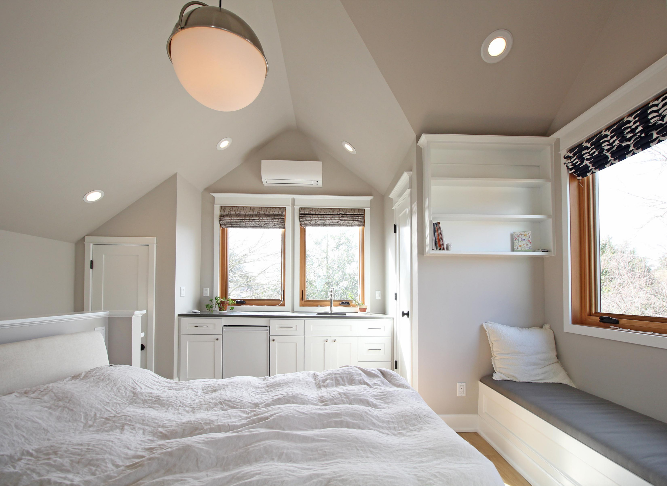 The suite includes a small hotel-style kitchenette originally intended as a convenience for renters. Parker left the staircase open to make the entire space feel more open. And the staircase wall serves as the headboard. There are two more windows higher than this wall just across the staircase. (They can be seen on the left side of the house in the first photo.)