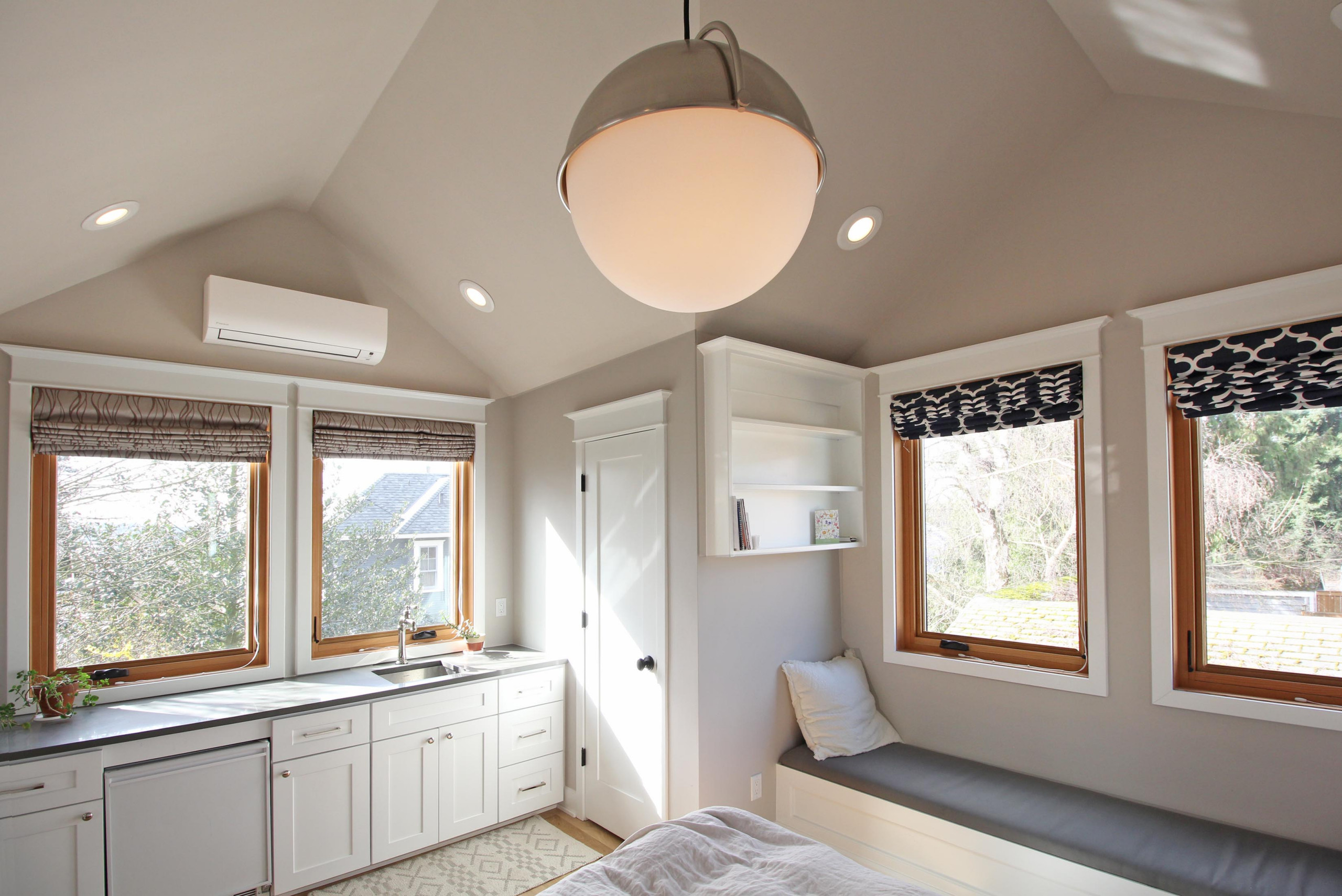 Upstairs, Parker designed a vaulted ceiling that’s 11 feet high at its highest point. Along with numerous windows, it makes the space feel airy and bright. A large globe pendant light suits the scale of the high ceiling.