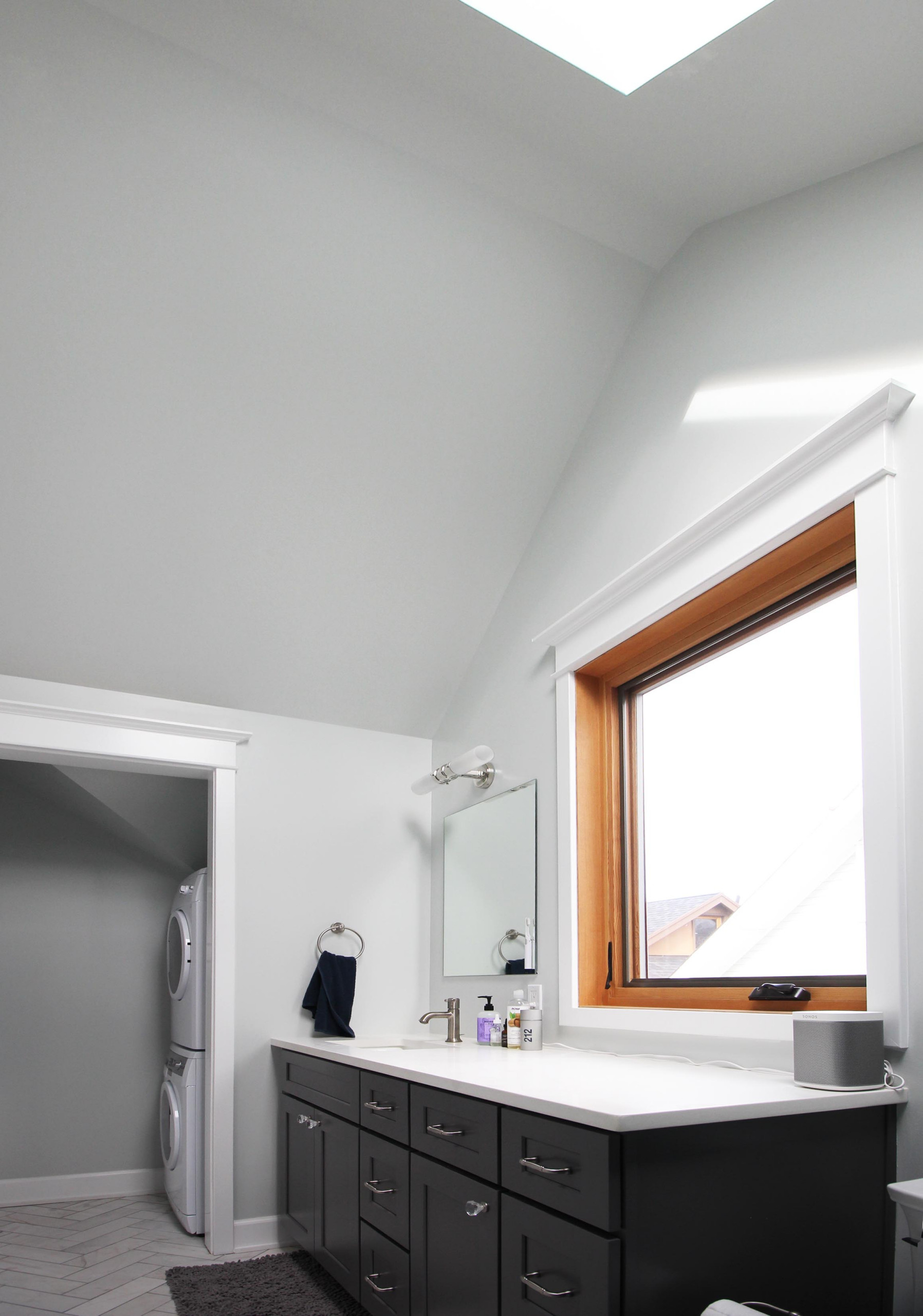 “This bathroom runs the full width of the cottage,” Parker says. The vanity is big enough for two people to share. A large window and skylight fill the room with natural light. Parker also worked in an alcove to accommodate a stackable washer-dryer set.